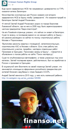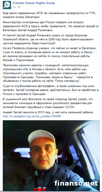 В сообщении на странице Крымской правозащитной группы в социальной сети «Фейсбук» говорится, что еще одним задержанным Федеральной службой безопасности по подозрению в диверсии оказался житель города Евпатории, уроженец Львовской области, который работает в строительной сфере. Корреспондентам издания «Украина сегодня: Finanso.net» удалось выяснить, что задержанным является 41-летний мужчина, родом из Борислава Львовской области, Захтей Андрей Романович. Известно, что в 2006 году на задержанного было зарегистрировано частное предприятие «Евро-пластстрой». На странице самого Захтея Андрея указано, что в настоящее время он проживает в Евпатории. Примечательно, что его резюме можно найти на сайтах по поиску работы в сфере строительства в Подмосковье и Москве, что свидетельствует о том, что в последнее время он не находил работу в Крыму. В объявлении по поиску работы на одном из сайтов говорится: «Выполняем ремонты квартир и помещений, металлоконструкции, строительство АЗС в Москве и области. Есть стаж работы начальником строительного участка, прорабом, мастером отделочных работ. Проживаю в Одинцово. Принимаем заказы в Крыму». Примечательно, что по опубликованным фотографиям, а также указанным под ними геотегам можно определить, что действительно Захтей последнее время был на заработках в России и проживал в Одинцово. Стоит также отметить, что на своей странице в социальной сети «ВКонтакте» Захтей указал, что занимается «помощью в оформлении российского гражданства для жителей стран бывшего СССР и ближнего зарубежья». Напомним, ранее издание уже сообщало, что Федеральная служба безопасности задержала в Крыму 39-летнего Евгения Панова, которого ФСБ называет организатором «теракта» на Крымском полуострове. |
