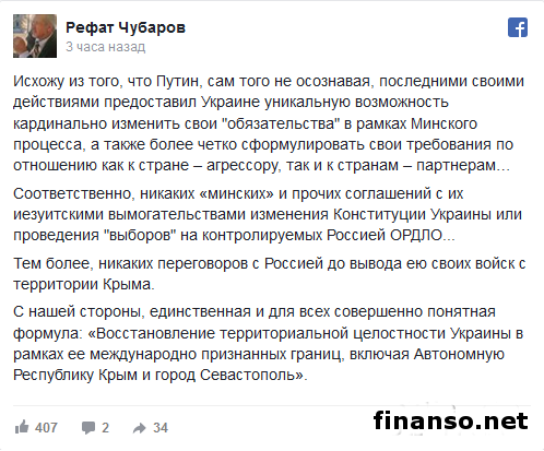 Сам того не осознавая, последними своими действиями президент Российской Федерации Владимир Путин предоставил Украине уникальную возможность кардинально изменить свои обязательства в рамках Минского процесса. Информацию об этом на своей странице в социальной сети «Фейсбук» высказал председатель Меджлиса крымскотатарского народа Рефат Чубаров.