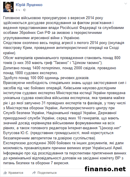 Председатель Генеральной прокуратуры Украины Юрий Луценко обнародовал статистику в досудебном расследовании по факту начала и ведения властью Российской Федерации агрессивной войны с Украинским государством. Как передают корреспонденты издания «Украина сегодня: Finanso.net», такие данные генпрокурор привел на своей странице в социальной сети «Фейсбук» во вторник, 30 августа текущего года. В соответствии со словами Юрия Луценко, следствие охватило весь период агрессии с февраля месяца 2014 года – и оккупацию полуострова Крым, и проведение антитеррористической операции на востоке Украинского государства. Примечательно, что объем материалов уголовного производства составляет более 800 томов, из которых 350 имеют гриф «Секретно» и «Совершенно секретно». Сотрудники следственных органов прокуратуры допросили более 1400 пострадавших, более 2 тысяч свидетелей, а также было проведено более 1800 судебных экспертиз. В соответствии со словами Юрия Луценко, было добыто более ста тысяч единиц вещественных доказательств российской агрессии в Украине. Так, по словам генпрокурора, была проведена «уникальная судебная комиссионная военная экспертиза», которая длилась практически целый год и в которую был вовлечен 31 ведущий специалист и эксперт. Глава ГПУ отметил, что экспертиза исследовала 3600 боевых и других документов, которые дали возможность проанализировать причины больших потерь бойцов ВСУ. В это же время генпрокурор пообещал доложить на заседании комитета ВР по вопросам безопасности и обороны, которое состоится 7 сентября, информацию о ходе расследования и перспективах привлечения виновных к уголовной ответственности. |