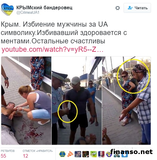 В аннексированном Владимиром Путиным Крыму, в центре города Севастополя в четверг, 8 августа, был избит 39-летний украинец Игорь Мовенко. В Интернете было обнародовано видео окровавленного пострадавшего.Как передают корреспонденты «Украина сегодня: Finanso.net», автор видео сообщил, что инцидент с избиением украинца произошел возле торгового центра «Новус». Мужчина, по словам автора, был избит сотрудником полиции в штатском за украинскую символику. Также автор видео сообщил: «По-видимому, зачинщицей всего этого была беременная дама, жена избивающего. Это именно она начала голосить, когда на велосипеде увидела украинскую символику. Вот так». В свою очередь КРЫМский бандеровец в «Твиттере» сообщил: «В Севастополе за украинскую символику был зверски избит житель Керчи Мовенко Игорь (1977 г. р.). Избивал его человек в гражданском, который представился сотрудником полиции. Руки пострадавшего были связаны за спиной пластиковыми стяжками, которые "случайно" оказались у избивающего. Прибывшие на место расправы полицаи всячески поддерживали нападавшего». Избитый мужчина был увезен в больницу «скорой» в сопровождении полиции. В сообщении также говорится: «В итоге: пункция спинного мозга на предмет внутричерепного кровоизлияния, перелом носа, перелом скулы. На потерпевшего Федеральная служба безопасности завела дело за символику «Азова» «как фашистскую организацию» и за драку. Пострадавшему нужна срочная юридическая помощь!». |