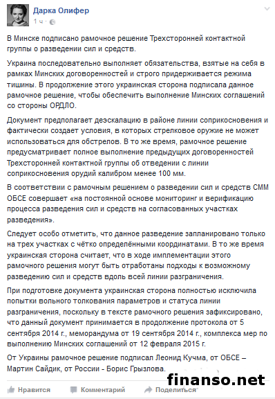 Как удалось выяснить корреспондентам издания «Украина сегодня: Finanso.net», она сообщила: «Документ предполагает деэскалацию в районе линии соприкосновения. Кроме того, он фактически создает условия, в которых стрелковое оружие не может использоваться для обстрелов. Рамочное решение также предусматривает полное выполнение предыдущих договоренностей Трехсторонней контактной группы об отведении орудий калибром менее 100 миллиметров с линии соприкосновения». Дарья Олифер также добавила, что, согласно рамочным решениям о разведении средств и сил, Специальная мониторинговая миссия ОБСЕ (СММ ОБСЕ) совершает «на постоянной основе мониторинг и верификацию процесса разведения сил и средств на согласованных участках разведения». Пресс-секретарь Леонида Кучмы особо отметила, что данное разведение запланировано на трех участках в зоне проведения антитеррористической операции с четко определенными координатами. По ее словам, речь идет о населенных пунктах Станица Луганская, Золотое и Петровское. Олифер добавила: «При этом украинская сторона считает, что в ходе имплементации этого рамочного решения могут быть отработаны подходы к возможному разведению сил и средств вдоль всей линии разграничения». При подготовке такого документа, по ее словам, украинская сторона полностью исключила попытки вольного толкования параметров и статуса линии разграничения, так как в тексте рамочного решения было зафиксировано, что этот документ принимается в продолжение комплекса мер по выполнению Минских соглашений от 12 февраля 2015 года, меморандума от 19 сентября 2014 года, а также протокола от 5 сентября 2014 года. Она также подчеркнула, что Украинское государство последовательно выполняет свои обязательства по Минским соглашениям и строго придерживается режима тишины. Дарья Олифер добавила: «Украинская сторона подписала рамочное решение, чтобы обеспечивать выполнение соглашений, достигнутых в Минске, со стороны самопровозглашенных ЛДНР». Леонид Кучма подписал рамочное решение от Украины, Мартин Сайдик сделал это от имени ОБСЕ, а Борис Грызлов – от России. |