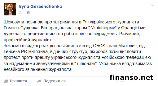 В Центре общественных связей Федеральной службы безопасности Российской Федерации сообщили, что в России задержанного украинского журналиста Романа Сущенко обвиняют в сборе информации о деятельности Вооруженных сил России, о чем пишет «Интерфакс».Как передают корреспонденты «Украина сегодня: Finanso.net», в Федеральной службе безопасности считают, что Сущенко является кадровым сотрудником Главного управления разведки Министерства обороны Украины в звании полковника. В ведомстве заявили: «Гражданин Украинского государства целенаправленно собирал сведения о деятельности Вооруженных сил и войск Национальной гвардии РФ, составляющие государственную тайну, утечка которых за рубеж могла нанести ущерб обороноспособности государства». Отмечается также, что Федеральная служба безопасности возбудили уголовное дело по статье «Шпионаж». В настоящее время ведется следствие. В свою очередь, представитель Украины в гуманитарной подгруппе Трехсторонней контактной группы, первый вице-спикер Верховной Рады Ирина Геращенко прокомментировала задержание в «Фейсбуке» так: «Новостью о задержании Сущенко я была шокирована. Он работает собкором Укринформа во Франции. Ждем немедленных заявлений от Организации по безопасности и сотрудничества в Европе (ОБСЕ) и других структур, которые обязаны выразить протест против ареста украинца Российской Федерацией по надуманным обвинениям в «шпионаже». Власти Украины требуют немедленного освобождения журналиста». В соответствии с данными СМИ, Романа Сущенко задержали в Москве еще 30 сентября, но Киев узнал об этом только 2 октября. Правозащитники заявили, что случайно встретили Сущенко в камере карантинного отделения Лефортовской тюрьмы. Ранее издание уже сообщало, что адвокат Марк Фейгин прибыл в Лефортово, чтобы составить ряд документов по делу Сущенко. |