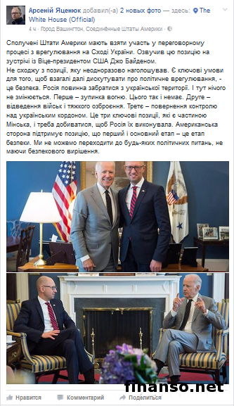 Как удалось выяснить корреспондентам издания «Украина сегодня: Finanso.net», сразу после встречи с Байденом в Вашингтоне Яценюк сообщил: «Украинский вопрос был, есть и будет продолжать быть одним из ключевых внешнеполитических вопросов для Соединенных Штатов». Так, экс-премьер напомнил, что нынешняя администрация Соединенных Штатов Америки внесла значительный вклад в поддержку Украины, в частности, выделила три миллиарда долларов США кредитных гарантий, ввела против России санкции вследствие агрессии последней против Украины, а также помогли нашей стране реструктуризировать 20 миллиардов американских долларов долга перед внешними кредиторами. Помимо прочего, была оказана помощь по запуску кредитной помощи Международного валютного фонда и Всемирного банка, а также начаты военные учения для украинского войска и передано немало не летального оружия. Арсений Яценюк подчеркнул: «Цель этой встречи – чтобы администрация будущего президента США продолжила такой же курс поддержки, какой мы видим в настоящее время». В это же время глава НФ отметил, что американская сторона имеет некие ожидания от Украины. В частности, по его словам, «это проведение приватизации в Украине, это принятие правильного бюджета – бюджета финансовой стабильности, это содержание политического единства и, естественно, дальнейшее выполнение нашего плана реформ». Бывший глава правительства Украины подчеркнул: «Именно от нас зависит, какая политика будет проводиться следующей администрацией США. Я уверен, что эта политика не просто не изменится, но аналогично будет направлена на дальнейшую поддержку Украинского государства». Переговорный процесс по Донбассу.Также сообщим, что на своей странице в социальной сети «Фейсбук» Арсений Яценюк сообщил, что во время переговоров с Байденом он призвал США принять участие в переговорном процессе по Донбассу. Бывший премьер сказал: «США должны принять участие в переговорном процессе по урегулированию ситуации на Донбассе. Такую позицию озвучил и на встрече с вице-президентом Соединенных Штатов Америки Джо Байденом». Помимо прочего, Арсений Яценюк назвал ключевые позиции для политического урегулирования ситуации на востоке Украины. В своем «Фейсбуке» он написал: «Существуют ключевые условия для того, чтобы вообще дискутировать дальше о политическом урегулировании – это безопасность. Российская Федерация должна убраться с территории Украинского государства. И здесь не меняется ничего. Первым приоритетом является остановка огня, чего мы так и не видим сегодня. Под номером два – отвод войск и тяжелого вооружения. Третья позиция – возвращение контроля над украинской границей. Это и есть три ключевые позиции, являющиеся частью Минского процесса, и необходимо добиваться, чтобы Российская Федерация выполняла их». |