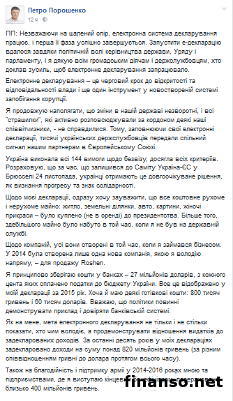 Украинский лидер Петр Порошенко подал электронную декларацию, в которой указывается, что он имеет наличными 60 тысяч долларов США и 800 тысяч в национальной валюте Украины – гривне. При этом президент заверил украинцев, что все его многочисленное движимое и недвижимое имущество было куплено еще до президентства. Как передают корреспонденты «Украина сегодня: Finanso.net», информацию об этом он обнародовал, в частности, и на своей странице в социальной сети «Фейсбук».Так, Петр Порошенко отметил: «Что касается моей декларации, то хочу сразу заметить, что все ценное движимое и недвижимое имущество - а это земельные участки, женские украшения, жилье, автомобили - было куплено еще до того, как я стал президентом. Кроме того, как правило, имущество было приобретено в то время, когда я не был на государственной службе. Что касается компаний, то все они были созданы в то время, когда я занимался бизнесом. В 2014 году была создана исключительно одна новая компания, которой я владею напрямую, - для продажи «Рошен». Также глава государства указал, что хранит наличными 60 тысяч американских долларов и 800 тысяч гривен, а на счетах в банках хранится «27 миллионов долларов США, с каждого цента которых уплачены налоги в украинский бюджет». Он также добавил: «По моему мнению, цель электронного декларирования не только и не столько показать, кто и чем владеет, но и продемонстрировать отношение расходов к задекларированным доходам. В моих декларациях за последние 10 лет указаны доходы на сумму более 820 миллионов гривен. Кроме того, мной и предприятиями, где я выступаю конечным бенефициаром, на протяжении 2014-2016 годов на благотворительность и поддержку армии было перечислено порядка 400 миллионов гривен». |