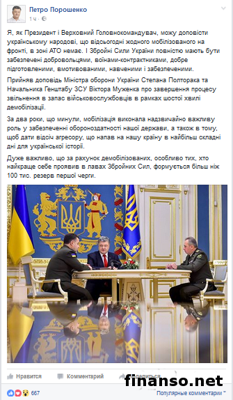 На своей странице в социальной сети Facebook Президент Украины Петр Порошенко обнародовал сообщение, где говорится, что с сегодняшнего дня в военном конфликте на Донбассе не принимает участия ни один мобилизованный военнослужащий.
