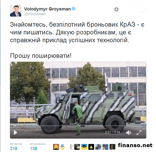 Гройсман показал обществу первый украинский броневик-беспилотникКатегория: Украина