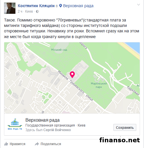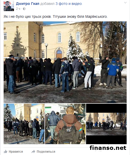 Со стороны улицы Институтской в столице Украины Киеве возле Мариинского парка собираются «титушки», о чем на своей странице в социальной сети «Фейсбук» сообщает журналист Дмитрий Гнап. Как передают корреспонденты «Украина сегодня: Finanso.net», в своем аккаунте журналист написал: «Этих трех лет как и не было… Возле Мариинского снова собираются титушки». Информацию о собрании толпы «титушек» в Киеве со стороны Институтской также подтверждает и режиссер объединения «Вавилон 13» Константин Кляцкин. Он сообщил: «Помимо откровенно «70-гривневых», а это размер стандартной платы за митинг тарифного майдана, со стороны улицы Институтской начинают подходить откровенные "титушки". Ненавижу эти рожи. Сразу же вспомнилось, как именно на этом же месте когда-то ранее в оцепление бросили гранату». Владимир Вятрович, директор Института национальной памяти, в свою очередь, на своем аккаунте в Facebook написал: «По Алее Героев Небесной Сотни маршем идут сотни майданарбайтеров, и это хуже той власти, которая не исполнила того, что обещала». Издание «Лига.нет», ссылаясь на источник в Министерстве внутренних дел Украины, пишет, что те, кого опознали в Мариинском парке как «титушек», это так называемая Городская стража, которую связывают с политиками, приближенными к руководству города. |