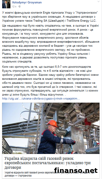 Как передают корреспонденты «Украина сегодня: Finanso.net», французская компания Engie подписала в октябре месяце соглашение с «Укртрансгазом» о хранении газа в ПХГ Украины. Кроме того с украинским государством заключили договора и такие компании как TrailStone Energy LLC и Trading SA (Швейцария). При этом глава Кабинета министров Владимир Гройсман отметил: «Совсем еще недавно даже надеяться на такое нельзя было, но вот уже сегодня в Украине начинает формироваться полноценный энергорынок. Рынок – это конкуренция и конкурентные цены для потребителей. Увеличение объемов поступлений от государственных компаний в бюджет Украины, увеличение собственной добычи газа, формирование полноценного энергорынка, а также внедрение энергоэффективности – это все последствия тех решений по оздоровлению сектора энергетики, которые мы принимаем». В свою очередь в пресс-службе «Укртрансгаза» подтвердили информацию о подписании договоров между Украиной и тремя европейскими компаниями, отметив, что соглашения были заключены для транспортировки и хранения природного газа в украинских хранилищах с тремя поставщиками из Европы. В компании подчеркнули, что среди этих предприятий – TrailStone Energy LLC (представительство в Украине), ENGIE (Франция), а также DufEnergy Trading SA (Швейцария). Игорь Прокопив, являющийся президентом «Укртрансгаза», подчеркнул, что уже в декабре 2016 года ожидаются тестовые поставки газа. |
