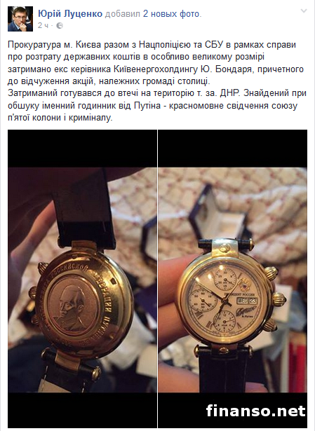 В своем сообщении Юрий Луценко написал: «Совместно с Национальной полицией и Службой безопасности Украины прокуратура города Киева в рамках уголовного дела о растрате госсредств в особо большом размере был задержан бывший руководитель «Киевэнергохолдинга» Юрий Бондарь, который причастен к отчуждению акций, принадлежавших общине столицы». Как удалось выяснить корреспондентам «Украина сегодня: Finanso.net», в соответствии со словами генерального прокурора Украины, Бондарь принимал участие в отчуждению акций, которые принадлежали общине Киева. Генеральный прокурор Украины заявляет, что задержанный экс-чиновник готовился к бегству на территорию самопровозглашенной Донецкой Народной Республики. При этом Луценко отметил: «Во время обыска у Бондаря были найдены именные часы от Владимира Путина – красноречивое свидетельство союза пятой колонны и криминала». |
