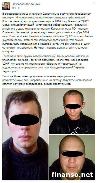 Как информируют корреспонденты «Украина сегодня: Finanso.net», по сообщению правоохранителя, среди задержанных числится бывший майор милиции, который в ноябре 2014 года был уволен из органов внутренних дел. Аброськин также подчеркнул: «Этот персонаж, бывший активный поборник Донецкой Народной Республики, после событий «русской весны» начал вести замкнутый образ жизни, пытаясь быть неприметным в надежде на то, что его участие в незаконном вооруженном формировании останется неизвестным. Однако увы… пришло время дать ответ за содеянное». Кроме него были задержаны двое мужчин, утверждающие, что на блокпостах они стояли «за идею», а денег они за это не получали. После того как террористы бежали из Константиновки, то задержанные сделали выбор остаться на подконтрольной Украине земле. Сейчас они всячески убеждают, что не поддерживали никаких отношений с членами НВФ. Ранее перед этим сотрудники Службы безопасности Украины задержали боевика 25 лет, который был так называемым главой военной комендатуры одного из районов оккупированной Луганской области. Его подразделение удерживало, пытало и вывозило на принудительные работы патриотически настроенных жителей, в частности и местных представителей прессы. |
