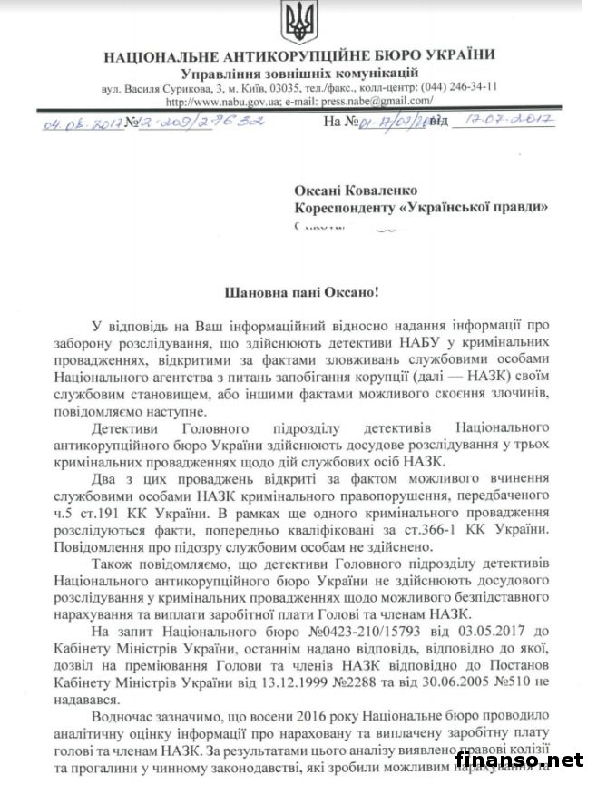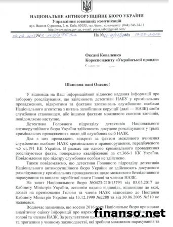 Как удалось выяснить корреспондентам «Украина сегодня: Finanso.net», детективы антикоррупционного бюро Украины осуществляют досудебное расследование по трем уголовным производствам в отношении должностных лиц НАПК. По информации, два из названных производств были открыты в отношении должностных лиц украинского нацагенства по предотвращению коррупции по факту возможного совершения ими преступления, предусмотренного ч. 5 ст. 191 украинского УК. В ответе НАБУ также отмечается, что в рамках еще одного уголовного производства расследуются факты, квалифицируемые предварительно по ст. 366-1 украинского УК. Указанная статья касается декларирования недостоверной информации. Конкретные фамилии в НАБУ не называют.В полученном изданием ответе сказано, что должностным лицам сообщение о подозрении не осуществлялось. Там также нет никаких фамилий и о ком именно идет речь. Кроме того, в НАБУ подтвердили, что его сотрудниками не осуществляется предварительное расследование по уголовным производствам о возможном безосновательном начислении зарплат и премий главе и членам НАПК. В Бюро подтвердили также, что из Кабмина в ответ на сделанный ему 03.05.2017 г. запрос они получили ответ, что правительство не давало разрешения на премирование членов НАПК. По информации, осенью 2016, как отмечается НАБУ, после аналитической оценки был сделан вывод, что «в действующем законодательстве имеются существенные правовые пробелы и коллизии, которые сделали возможным начисление и выплаты премий членам НАПК вопреки принципам бюджетной системы Украины». В документе Бюро также отмечено, что НАБУ в целях устранения названных проблем «направило свои предложения Нацагенству по вопросам госслужбы». |