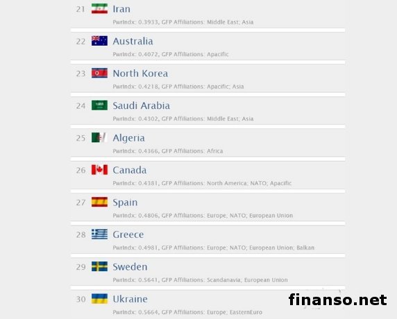 В текущем году Global Firepower, ежегодно составляющая рейтинг лучших армий мира, поместила Украину на тридцатое место (между Швецией и Мьянмой), информируют корреспонденты «Украина сегодня: Finanso.net». Сообщается, что на первом месте в рейтинге – армия США, на втором – России. В первую десятку также вошли Великобритания, Япония, Турция, Германия и Египет. Рейтинг лучших армий мира состоял из 133 стран. В Минобороны объяснили, что для создания рейтинга компания Global Firepower провела комплексное исследование, в ходе которого учитывала более 50 факторов. При этом страны-обладатели ядерных арсеналов получали бонусные баллы. Дополнительные баллы также получали страны, входящие в Организацию Североатлантического договора (НАТО). В сравнении со странами-соседями, Украина – на 3-м месте.В сравнении со странами-соседями Украина заняла 3-е место после России (2-е место) и Польши (19-е место). Необходимо отметить, что с каждым годом украинские Вооруженные силы поднимаются все выше в рейтинге лучших армий мира. Напомним, что в рейтинге паспортов мира украинский паспорт получил самый высокий результат из всех постсоветских стран, кроме стран Балтии. На счету в украинском паспорте 119 безвизовых стран, у него индивидуальный рейтинг 68, а глобальный – 30. В названном рейтинге первую строчку занимает Германия и Сингапур, гражданам которых доступен безвиз в 159 стран. С показателем в 158 безвизовых стран на втором месте разместились Швеция и Южная Корея. На третьем – с показателем 157 безвизовых стран – Италия, Дания, Франция, Финляндия, Норвегия, Испания, Япония, Великобритания и США. Паспорт гражданина РФ занимает 41-е место с показателем безвиза в 106 стран. |