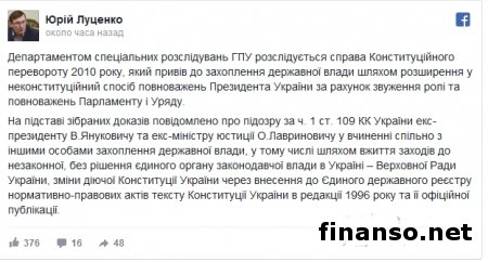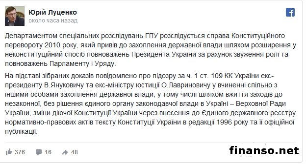 Корреспонденты «Украина сегодня: Finanso.net» информируют, что, по сообщению главы ГПУ, Департаментом спецрасследований Генпрокуратуры расследуется дело относительно конституционного переворота 2010 г., который привел к захвату госвласти путем расширения неконституционным способом полномочий президента страны за счет сужения роли и полномочий парламента и правительства. Ю. Луценко подчеркнул, что на основании собранных доказательств было сообщено о подозрении по ч. 1 ст. 109 украинского УК экс-президенту В. Януковичу и экс-руководителю Минюста А. Лавриновичу в совершении вместе с другими лицами захвата госвласти. Конституцию изменили без участия главного законодательного органа власти – парламента Украины.«Эти действия осуществлялись путем принятия мер к незаконному, без решения единственного в Украине законодательного органа власти – украинского парламента, изменения действующей Конституции страны через внесение в Единый госреестр нормативно-правовых актов текста Конституции Украины в редакции 1996 г. и его официального опубликования», - написал в соцсети глава ГПУ. Следует напомнить, что сегодня состоится очередное судебное заседание в деле относительно обвинения экс-президента Украины В. Януковича в государственной измене. |