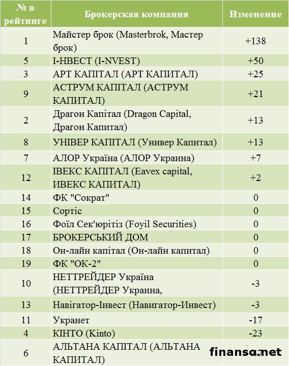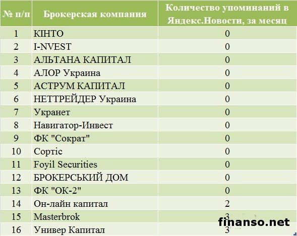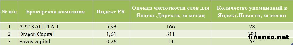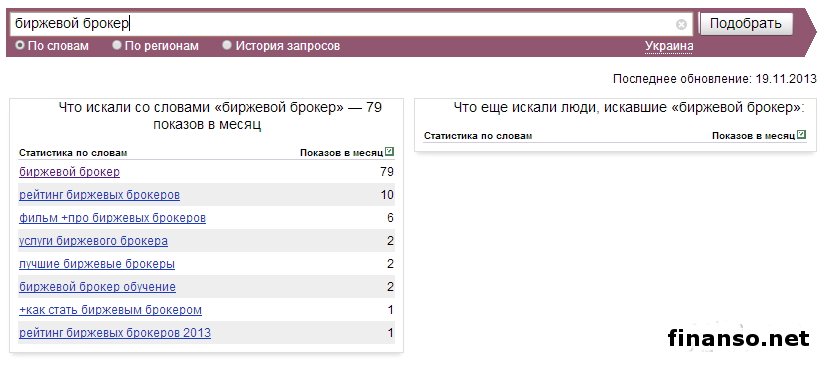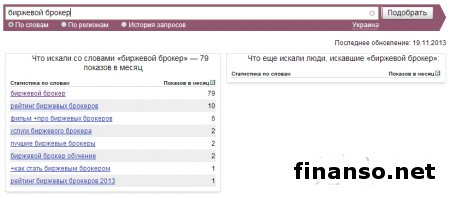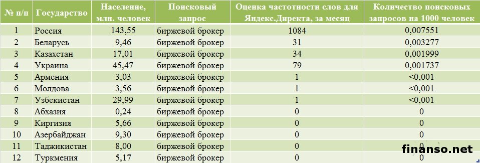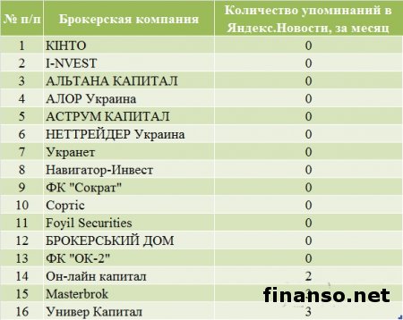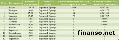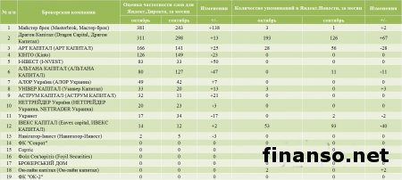 От мастерства брокера зависит, в конечном итоге, то, насколько довольными сделкой после ее завершения окажутся обе стороны. Потому каждому потенциальному клиенту брокерской компании необходимо выяснить, какие брокеры предоставляют максимально качественные услуги, и о каких брокерах позитивно отзываются те, кто уже стал их клиентом.Какие же биржевые брокеры стали наиболее популярными среди жителей Украины в октябре, выясняли аналитики издания для инвесторов "Украина сегодня: Finanso.net". Самым популярным брокером октября стал "Мастер брок".Популярность украинских биржевых брокеров анализировалась на основе следующих базовых критериев: - оценка частотности слов для Яндекс.Директа за месяц, которая рассчитывалась с помощью сервиса wordstat.yandex.ru; - частота упоминаний о биржевых брокерах в СМИ Интернета Украины, рассчитанная при помощи агрегатора Яндекс.Новости (news.yandex.ru); - регион анализа (а значит, и поиска в сервисе wordstat.yandex.ru) – Украина. На первом месте рейтинга популярности биржевых брокеров оказался "Masterbrok" (381 запрос украинцев в Яндексе за октябрь). Фондовый рынок Украины принимает эту компанию в своих просторах уже более 2-х десятков лет. И именно такой серьезный опыт работы отличает данного брокера от других компаний. "Мастер брок" зарегистрирован, а значит – может проводить и операции, в "Фондовой секции Биржи "Перспектива" и Фондовой секции Украинской биржи". Вторую позицию заняла брокерская компания "Dragon Capital" (311 запросов украинцев в Яндексе за месяц). "Драгон Капитал" обслуживают наибольшее количество украинских интернет-трейдеров. Помимо того, около трети торгов, проведенных на Украинской бирже, были проведены при участии данной брокерской компании. Третью ступень рейтинга популярности занял брокер "АРТ КАПИТАЛ" (166 запросов украинцев в Яндексе за месяц). Клиенты "АРТ КАПИТАЛА" имеют непосредственный доступ к Варшавской фондовой биржи, поскольку еще три года назад брокер стал ее IPO-партнером. Упор в "АРТ КАПИТАЛЕ" делается на инновационные ИТ-решения и на особый подход к каждому отдельному клиенту. Аутсайдерами по популярности в октябре оказались следующие брокерские компании, о которых украинцы ни разу за месяц не запрашивали в Яндексе: - ФК "Сократ"; - Сортіс; - Foyil Securities; - БРОКЕРСЬКИЙ ДОМ; - Он-лайн капитал; - ФК "ОК-2". Какие изменения произошли с популярностью биржевых брокеров Украины в октябре?Вне зависимости от опыта брокера, его успешности и имиджа, популярность компании не может оставаться на одном и том же уровне в связи с влиянием множества различных факторов. Как же изменилась популярность биржевых брокеров Украины с сентября по октябрь? Данные представленной таблицы свидетельствуют о следующем: - наибольший прирост популярности продемонстрировала компания "Masterbrok" (на 138 запросов украинцев в Яндексе в октябре больше, чем в сентябре); - наибольшее (хотя и относительно незначительное) падение продемонстрировал брокер "АЛЬТАНА КАПИТАЛ" (на 47 запросов украинцев в Яндексе в октябре меньше, чем в сентябре); - общий рост популярности брокерских компаний составил 15,5 процента (или 176 запросов украинцев в Яндексе). Россияне чаще всех в СНГ интересуются биржевыми брокерами.Выяснить, жители каких стран СНГ интересуются биржевыми брокерами чаще всего можно с помощью статистики поисковых запросов в wordstat.yandex.ru (при пересчете на 1 ты