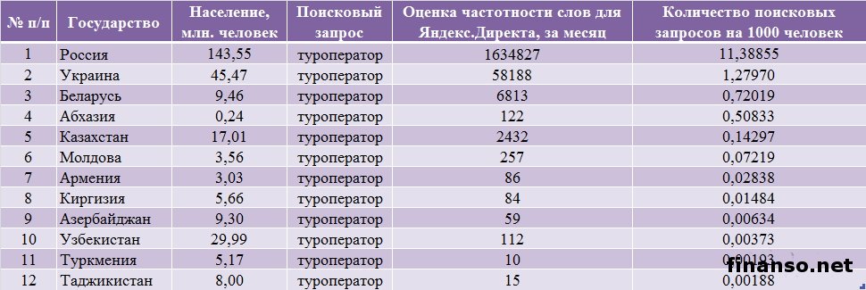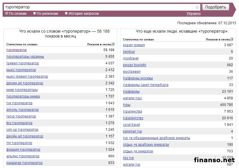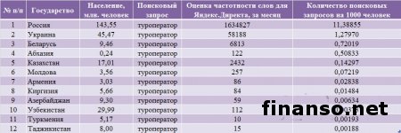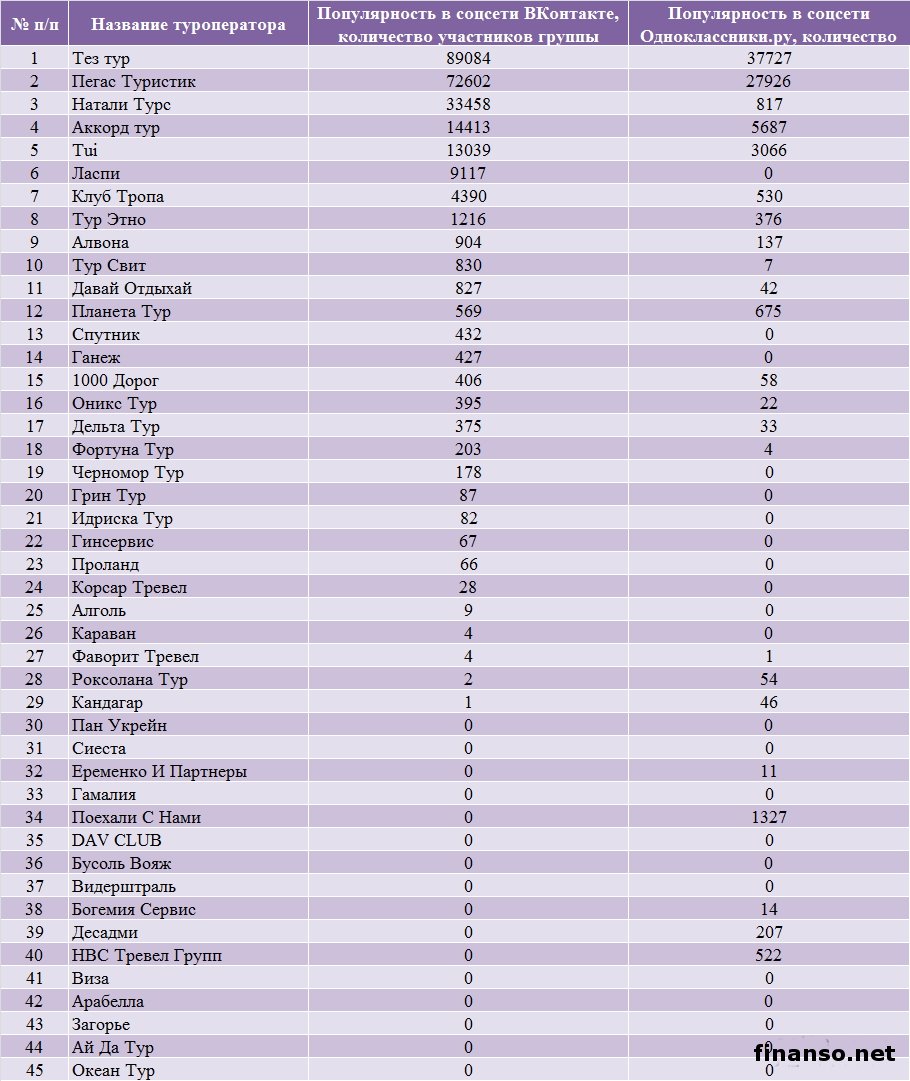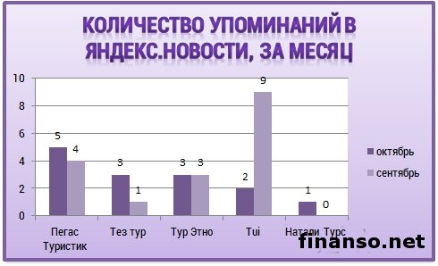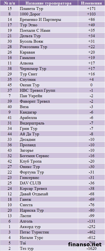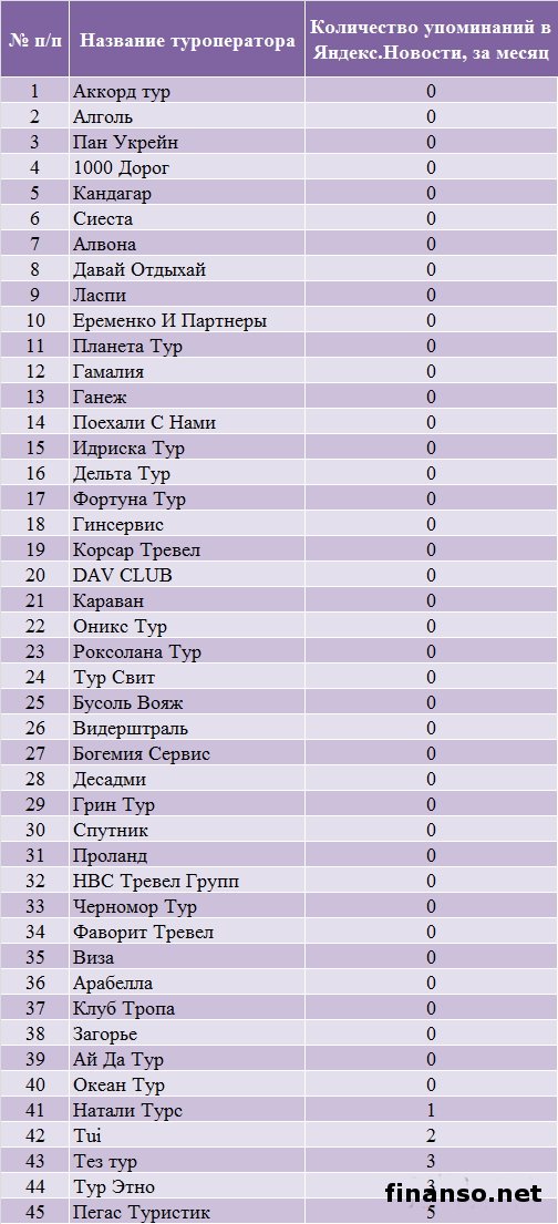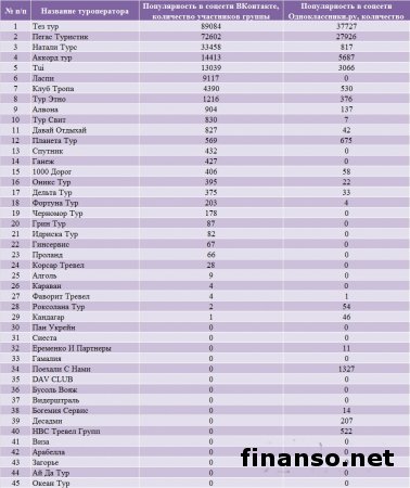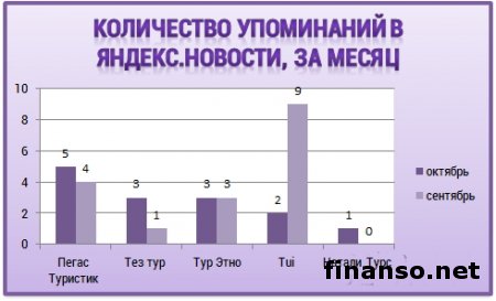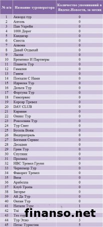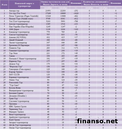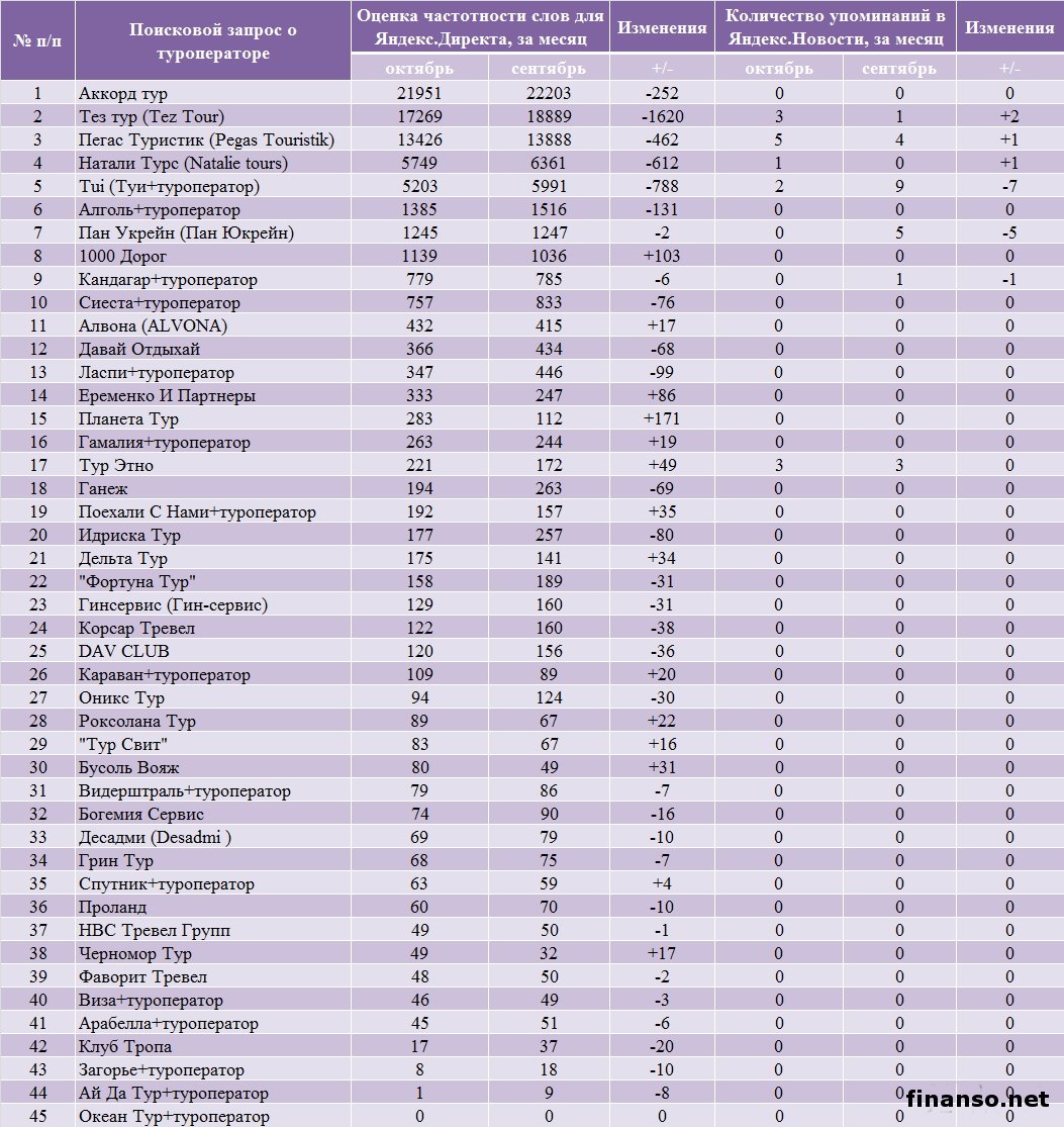 Какие же украинские туроператоры оказались наиболее популярными в октябре, выясняли аналитики журнала для инвесторов "Украина сегодня: finanso.net". Самый популярный туроператор Украины в октябре - "Аккорд тур".Базой для анализа популярности туроператоров Украины выступали такие критерии: - оценка частотности слов для Яндекс.Директа за месяц, рассчитываемая с помощью сервиса wordstat.yandex.ru; - частота упоминаний об украинских туроператорах в электронных изданиях Украины, расчет которой проводился при помощи агрегатора Яндекс.Новости (news.yandex.ru); - регион анализа (а значит, и поиска в сервисе wordstat.yandex.ru) – Украина. Первое место в рейтинге популярности туроператоров Украины занял "Аккорд Тур" (21951 запрос украинцев в Яндексе за октябрь). Туроператор предлагает разнообразнейшие туры по Украине и зарубежью. При этом туры учитывают всевозможные запросы клиентов и могут быть как праздничными, турами без ночных переездов, так и турами выходного дня, индивидуальными турами. Вторую позицию рейтинга издания для инвесторов "Украина сегодня: finanso.net" занял туроператор "Тез тур" (17269 запросов украинцев в Яндексе за октябрь). В ассортименте данного туроператора находятся 20 направлений, среди которых – Греция, Австрия, Египет, Испания, Мальдивы, Шри-Ланка, ОАЭ и другие страны. Третью ступень рейтинга популярности занял туроператор "Пегас Туристик" (13426 запросов украинцев в Яндексе за октябрь). На рынке Украины "Пегас Туристик" функционирует уже более 8-ми лет. За это время по всей территории были открыты несколько новых офисов, а также множество направлений, среди которых Кипр, Греция, Доминикана, Испания, Египет, Куба и другие государства. В пятерку лидеров по популярности в Украине вошли также туроператоры "Натали Турс" и "Tui" – 5749 и 5203 запроса украинцев в поисковой системе Яндекс за октябрь соответственно. Малопопулярными в Интернете в октябре оказались следующие туроператорские компании: - Клуб Тропа (17 запросов украинцев в Яндексе за месяц); - Загорье (8); - Ай Да Тур (1); - Океан Тур (0). Как изменилась популярность украинских туроператоров в октябре?Популярность любой организации не может оставаться постоянно стабильной: никому не удается вовсе избежать колебаний, связанных с множеством факторов. Однако популярность туроператоров может варьировать в пределах от нуля до бесконечности еще и по причине таких немаловажных факторов как сезон и погода. Насколько же изменилась популярность украинских туроператорских компаний в конце "бархатного" сезона? Исходя из данных представленной таблицы, можно сделать следующие выводы: - наибольший (хотя и незначительный) рост популярности продемонстрировали туроператоры "Планета тур", "1000 Дорог" и "Еременко и Партнеры" – соответственно на 171, 103 и 86 запросов в октябре больше чем в сентябре; - наибольшее падение продемонстрировала компания "Тез тур", о которой украинцы в октябре запросили в Яндексе на 1620 раз реже, чем в сентябре; - общее падение популярности туроператоров Украины в период с сентября по октябрь составило 5 процентов (или 3907 запросов); - наибольший спад популярности показали... самые популярные туроператоры, занимающие лидирующие позиции рейтинга; - в целом, несмотря на завершение бархатного сезона, популярность украинских туроператоров осталась достаточно высокой к концу октября, что свидетельствует как о том