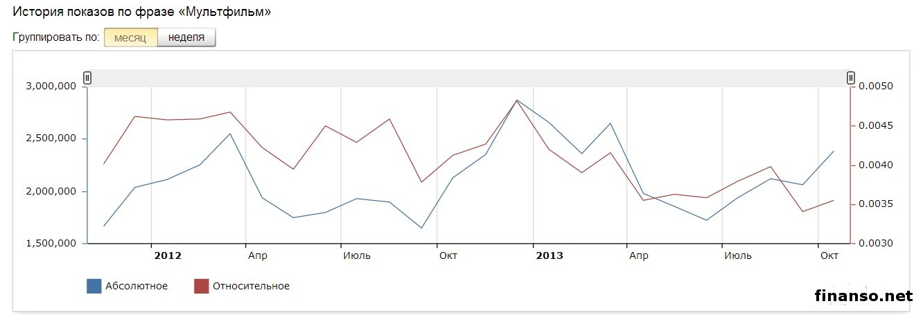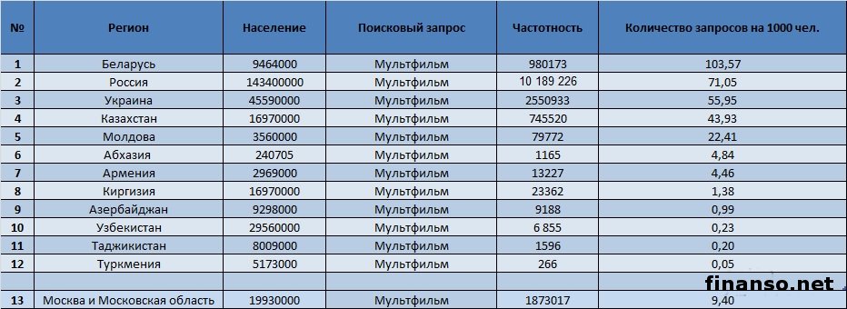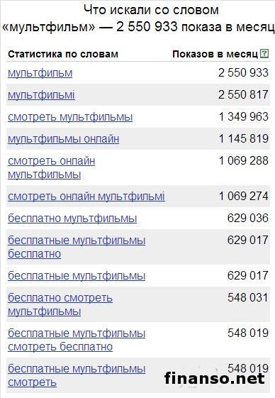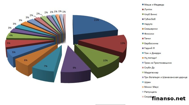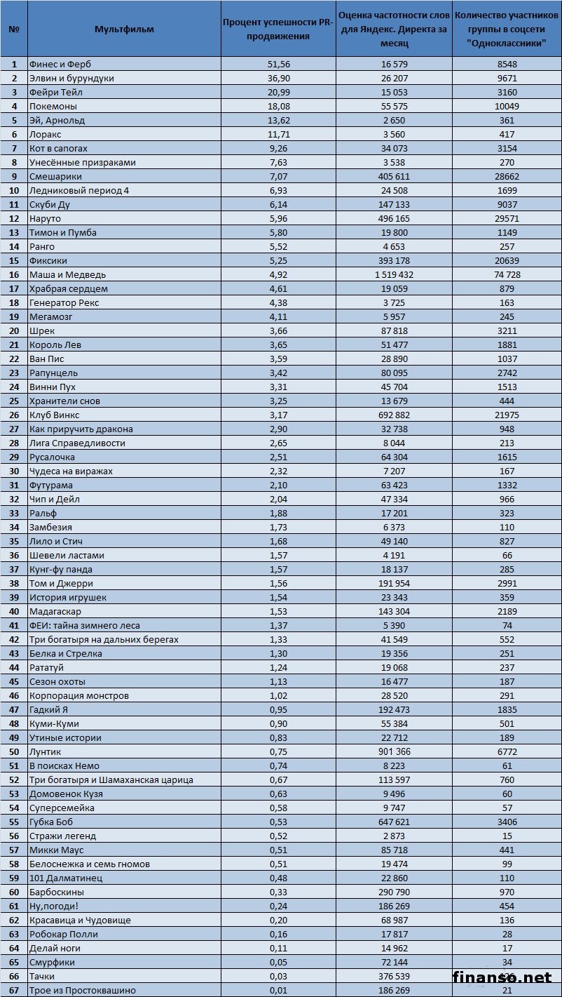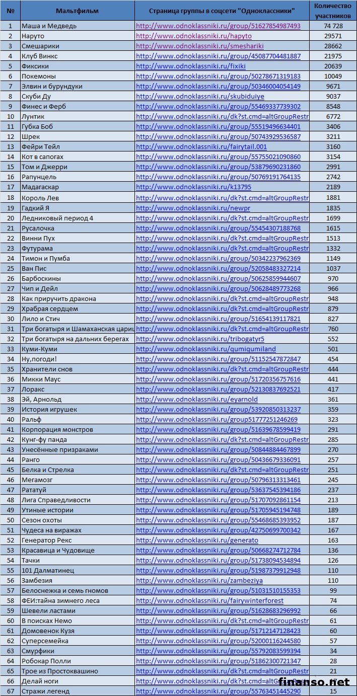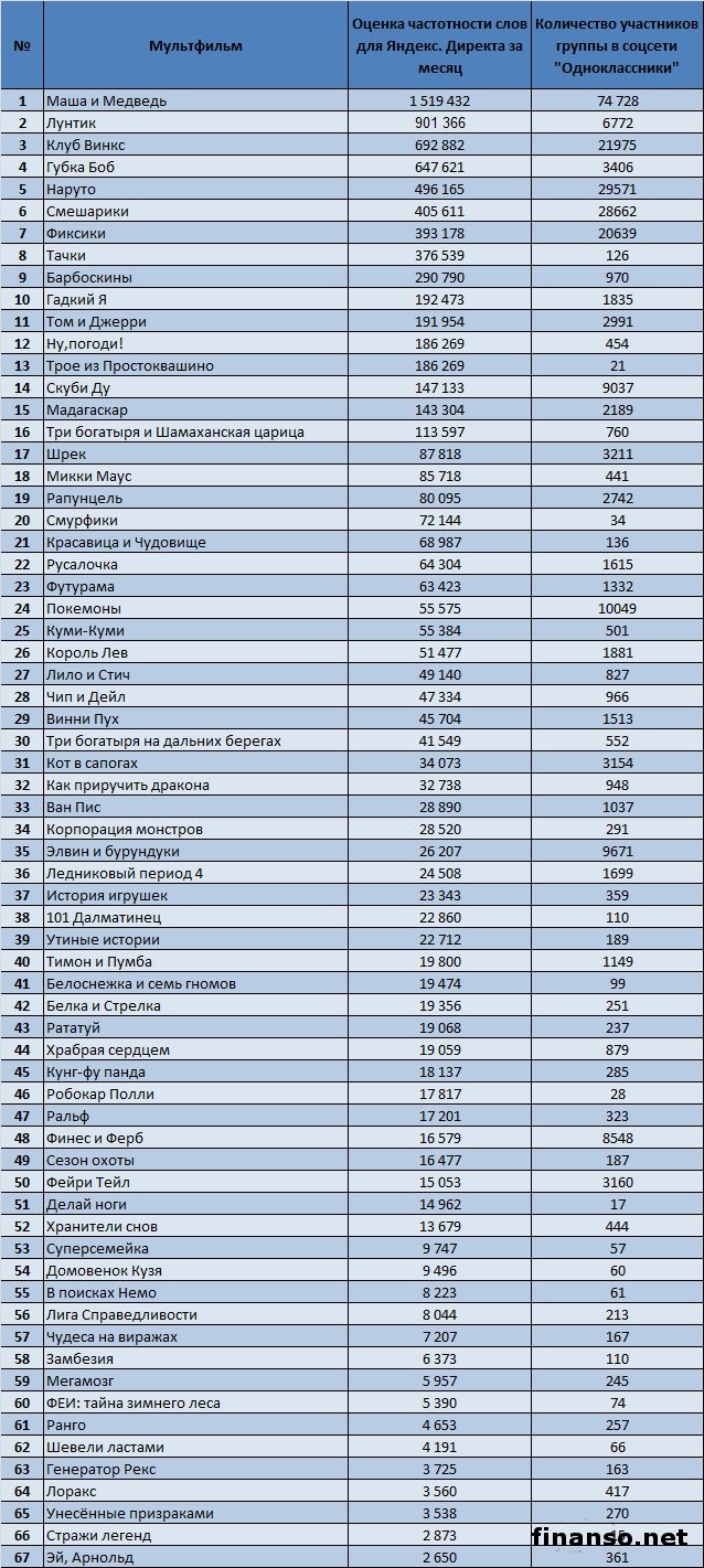 В социальной сети «Одноклассники» зарегистрированы миллионы пользователей, которые любят просматривать по нескольку раз свои любимые мультфильмы. Какие же самые популярные мультфильмы в Odnoklassniki.ru, разбирались аналитики раздела «Новости социальной сети Одноклассники», ведущего онлайн-журнала для трейдеров и инвесторов «Украина сегодня: finanso.net». «Маша и медведь», «Наруто» и «Смешарики» - самые популярные мультфильмы в соцсети Одноклассники».Для определения популярности мультфильмов в Odnoklassniki.ru, аналитики «Биржевого лидера» составили рейтинг групп, посвященных конкретному мультфильму, и отсортировали его по количеству участников. Как видно из таблицы, самым популярным мультфильмом в социальной сети «Одноклассники» оказался «Маша и Медведь» (74 728 человек в группе). Это прекрасный и добрый российский мультфильм про маленькую девочку Машу, проживающую в одном доме с большим и, на первый взгляд грозным Медведем. На втором месте по популярности в соцсети «Одноклассники.ру», оказался мультфильм «Наруто», снятый на основе японских комиксов, в котором рассказывается о маленьком ниндзя, желающим прославиться на весь мир. Веселый мультфильм «Смешарики» замыкает троку лидеров в соцсети «Одноклассники», с 28662 участниками в группе. Мультфильм состоит из множества серий, главными героями в которых выступают звери, изображенные в форме шариков. Этот мультик стал любимым не только среди самых маленьких зрителей, но и завоевал любовь миллионов взрослых. Всего в группах в социальной сети «Одноклассники», посвященных мультфильмам, состоит 265537 участников, 50% из которых приходится на вышеуказанную тройку. Следует отметить, что 28% от общего количества участников в данных группах, приходится на лидера рейтинга – мультфильм «Маша и Медведь». «Маша и Медведь», «Лунтик» и «Клуб Винкс» - самые популярные мультфильмы среди украинцев в поисковой системе Яндекс.Рейтинг популярности мультфильмов составлялся на основе следующих критериев: - оценка частотности слов для Яндекс.Директа за месяц, которая рассчитывается с помощью сервиса wordstat.yandex.ru; - регион поиска – Украина. Как видно из таблицы, наибольшее количество запросов в поисковой системе Яндекс, жители Украины ввели по мультфильму «Маша и Медведь» - 1 519 432. На втором месте по популярности оказался «Лунтик» - 901 366 запросов в Яндексе за последний месяц. Тройку лидеров замыкает «Клуб Винкс» с 692 882 запросами. Далее следуют: - Губка Боб - 647 621 запросов в Яндексе за месяц; - Наруто - 496 165; - Смешарики - 405 611; - Фиксики - 393 178; - Тачки - 376 539; - Барбоскины - 290 790; - Гадкий Я - 192 473; - Том и Джерри - 191 954; - Ну,погоди! - 186 269; - Трое из Простоквашино - 186 269; - Скуби Ду - 147 133; - Мадагаскар - 143 304; - Три богатыря и Шамаханская царица - 113 597; - Шрек - 87 818; - Микки Маус - 85 718; - Рапунцель - 80 095; - Смурфики - 72 144; - Красавица и Чудовище - 68 987; - Русалочка - 64 304; - Футурама - 63 423; - Покемоны - 55 575; - Куми-Куми - 55 384; - Король Лев - 51 477; - Лило и Стич - 49 140; - Чип и Дейл - 47 334; - Винни Пух - 45 704; - Три богатыря на дальних берегах - 41 549; - Кот в сапогах - 34 073; - Как приручить дракона - 32 738; - Ван Пис - 28 890; - Корпорация монстров - 28 520; - Элвин и бурундуки - 26 207; - Ледниковый период 4 - 24 508; - История игрушек - 23 343; - 101 Далматинец - 22 860; - Утиные истории - 22 712; - Тимон и Пумба - 19 800; - Белоснежка и семь гномов - 19 474; - Белка и Стрелка - 19 356; - Рататуй - 19 068; - Храбрая серцем - 19 059; - Кунг-фу панда - 18 137; - Ро