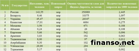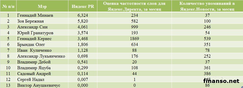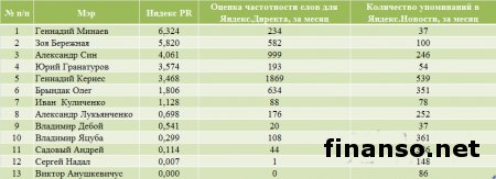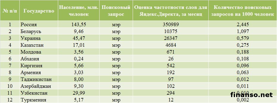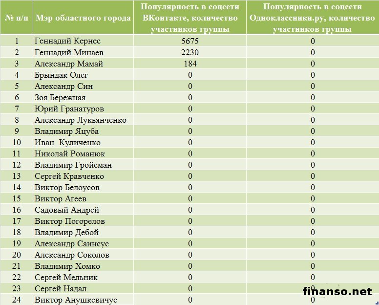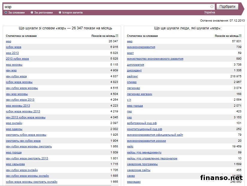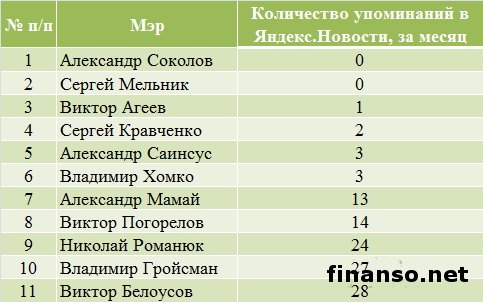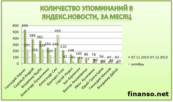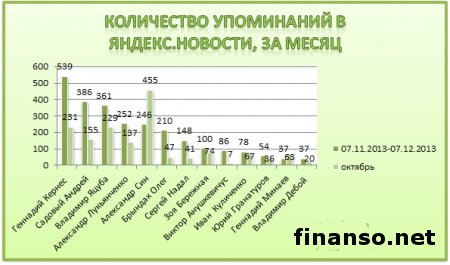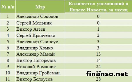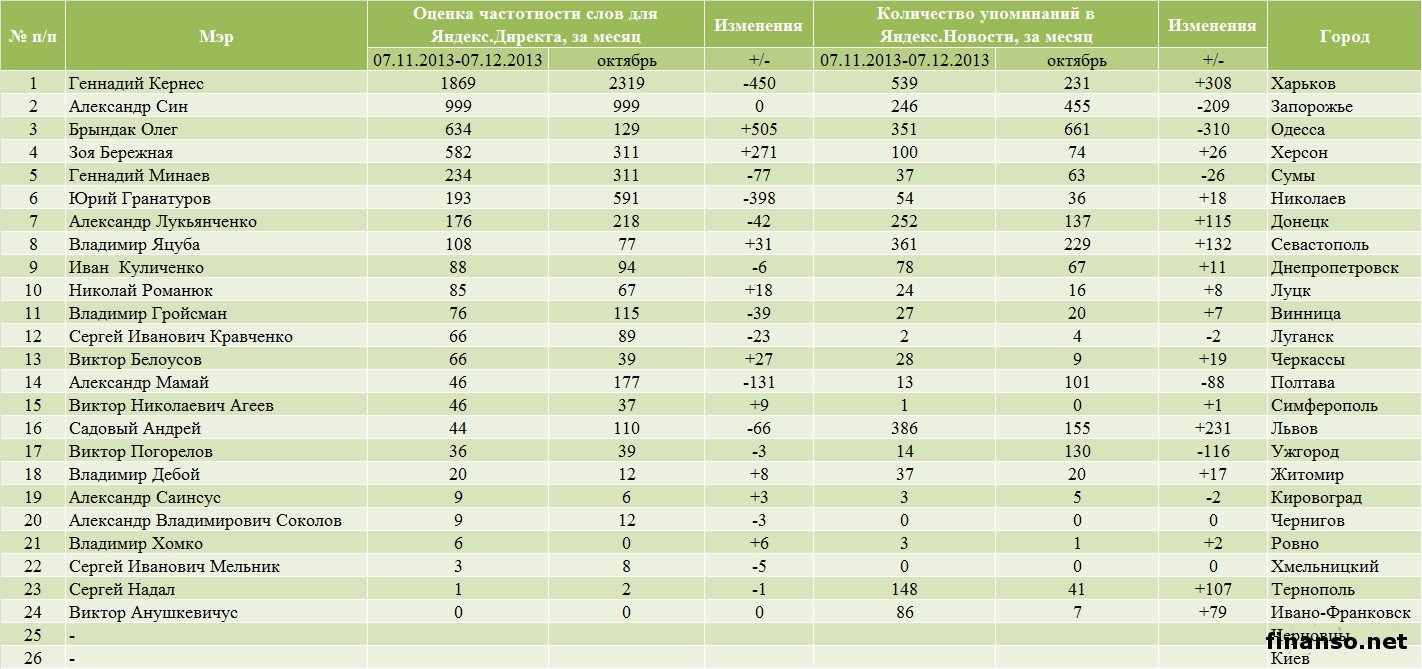 Какие же мэры украинских областных городов являются на сегодняшний день самыми популярными среди жителей Украины, выясняли аналитики журнала для инвесторов "Украина сегодня: finanso.net". Самая высокая популярность среди мэров обласных городов Украины – у Геннадия Кернеса.Анализ популярности мэров областных городов Украины проводился на базе следующих критериев: - оценка частотности слов для Яндекс.Директа за месяц, рассчитанная с помощью сервиса wordstat.yandex.ru; - частота упоминаний о мэрах областных городов в украинских интернет-изданиях, рассчитанная с помощью агрегатора Яндекс.Новости (news.yandex.ru); - регион анализа (а, следовательно, и поиска в сервисе wordstat.yandex.ru) – Украина. Первое место в рейтинге популярности мэров областных городов Украины досталось Геннадию Кернесу – мэру Харькова (1869 запросов украинцев в поисковой системе Яндекс за период с 7 ноября по 7 декабря 2013 года). Новостными поводами о мэре Харькова были день местного самоуправления в Харькове; спор Г.Кернеса во время интервью на одном из украинских каналов с мэром Тернополя Сергеем Надалом и другие. На второй позиции рейтинга издания для инвесторов "Украина сегодня: finanso.net" оказался мэр Запорожья Александр Син (999 запросов украинцев в Яндексе за месяц). Информационными поводами о мэре Запорожья стали его предложение о концепции реформирования местного самоуправления; митинг под зданием мэрии в Запорожье и другие. Третью ступень рейтинга популярности занял мэр Одессы Брындак Олег (634 запроса украинцев в Яндексе за месяц). Новостными поводами о мэре Одессы стали перекрытие улицы в центре города на год из-за стройки, митинг под стенами МВД в Одессе и другие. Не слишком популярными оказались следующие мэры областных городов Украины: - Александр Саинсус (9 запросов украинцев в поисковой системе Яндекс за период с 7 ноября по 7 декабря 2013 года); - Александр Соколов (9); - Владимир Хомко (6); - Сергей Мельник (3); - Сергей Надал (1); - Виктор Анушкевичус (0). Как изменилась популярность украинских мэров в ноябре?Какой бы ни была деятельность публичных личностей, уровень их популярности никогда не будет находиться на одном уровне. Под влиянием тех или иных факторов популярность мэров может варьировать от абсолютного нуля до бесконечности. Какие же изменения произошли в популярности мэров украинских областных городов в период с 7 ноября по 7 декабря 2013 года? Исходя из данных представленной таблицы, можно сделать следующие выводы: - наибольший прирост популярности продемонстрировали и.о. мэра Одессы Брындак Олег (на 505 запросов украинцев в Яндексе больше, чем в октябре) и мэр Херсона Зоя Бережная (на 271 запрос больше); - самое большее и достаточно сильное падение показали мэр Харькова Геннадий Кернес (на 450 запросов украинцев в Яндексе меньше, чем в октябре) и мэр Николаева Юрий Гранатуров (на 398 запросов меньше); - общее падение популярности составило 9,3 процента (или 566 запросов украинцев в Яндексе). Реже всего среди жителей стран СНГ интересуются мэрами в Туркмении.Чтобы определить, жители каких стран СНГ интересуются мэрами чаще всего, можно воспользоваться данными статистики сервиса wordstat.yandex.ru по запросу "мэр", при этом данные рассчитываются для каждой страны отдельно и в пересчете на 1 тысячу населения: Согласно представленным данным можно сделать следующие выводы: - чаще всего деятельност