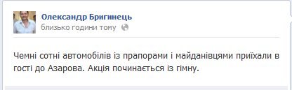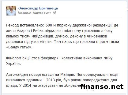 Автомайдановцы – участники Евромайдана на автомобилях сегодня прибыли к имению премьер-министра Украины Николая Азарова, которое располагается в Конча-Заспе и начали пикет. Такую информацию на своей страничке в социальной сети Facebook написал народный депутат Верховной Рады Украины от партии “Батькивщина” Александр Бригинец. Более детально об этом передают корреспонденты издания “Украина сегодня: Finanso.net”.Так, на своей странице народный избранник написал: “Вежливые сотни автомобилей с флагами и майдановцами приехали в гости к Азарову. Акция начинается с гимна”. ![]() А уже после того, как евромайдановцы на своих транспортных средствах прибыли к резиденции, депутат написал: “Установлен рекорд: 500 метров забора государственной резиденции, где живут премьер Азаров и спикер Рыбак подверглись плотным хлопаньям со стороны нескольких тысяч майдановцов”. Также нардеп отметил, что по забору демонстранты стучали под ритм лозунгов – “Банду геть!”. ![]() В ходе такой акции произошел один-единственный инцидент, непосредственно перед тем, как евромайдановцы на своих авто добрались до имения Азарова, на подъезде к селу Новые Петровцы, откуда дорога ведет к резиденции президента Украины. Так, сообщим, что именно в том месте на пути у Автомайдана стал КамАЗ и служебный автомобиль сотрудников ГАИ, которыми была преграждена дорога. Однако даже это не помешало демонстрантам добиться своей цели – они дружно столкнули с проезжей части дороги патрульную машину, стоявшую у них на пути, а водитель грузовика после незначительных убеждений активистом и вовсе самостоятельно убрал из дороги свой КамАЗ. Однако на пути митингующих оказался еще один кордон правоохранителей, который первые одолеть самостоятельно были просто не в состоянии. В результате такого поворота событий перед самой шеренгой милиционеров Автомайдан и начал проводить свой запланированный митинг. Вскоре к евромайдановцам присоединились оппозиционные лидеры, отметившие, что в случае, если власть не выполнит все ранее выдвинутые требования, а это освобождение всех задержанных на Евромайдане активистов и отставка правительства, то они будут посещать Президента Украины Виктора Януковича таким образом один раз в неделю. А в это время активисты Автомайдана времени не теряли. Одни писали на дороге, которая ведет к резиденции главы государства, приветствия президенту, другие били в барабаны…. Автомайдан не обошел стороной и поместье Медведчука.Сообщим, что также активисты на своих автомобилях посетили и поместье Виктора Медведчука. По дороге к нему никаких сотрудников милиции и преград евромайдановцы не встретили. И даже возле имения политического деятеля евромайдановцев никто не встретил. За столь короткое время, которое активисты Автомайдана пробыли возле поместья Медведчука, они успели оставить на заборе послание, которое является не совсем приятным для владельца имения, а также повредили нижнюю часть металлических ворот. Благодаря тому, что среди активистов были и народные депутаты Украины, митинг обошелся без более радикальных действий со стороны евромайдановцев на автомобилях. Поход к резиденции в Межигорье.“Побывав в гостях” в Конча-Заспе у поместья премьер-министра Украины Николая Азарова и спикера Верховной Рады Владимира Рыбака, а также возле имения украи