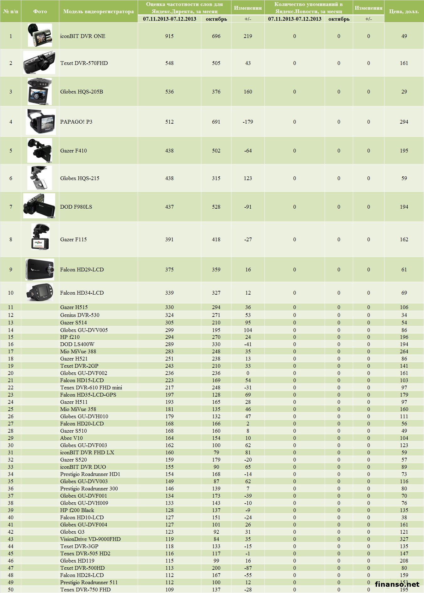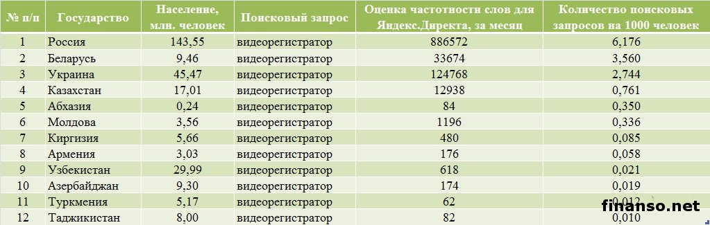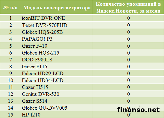 Какие же видеорегистраторы пользуются наибольшей популярностью в Интернете среди украинцев, разбирались аналитики журнала для инвесторов "Украина сегодня: finanso.net". Лидером по популярности стал видеорегистратор iconBIT DVR ONE.Базой для анализа популярности видеорегистраторов являлись следующие критерии: - оценка частотности слов для Яндекс.Директа за месяц, рассчитанная с помощью сервиса wordstat.yandex.ru; - частота упоминаний о видеорегистраторах, рассчитанная с помощью агрегатора news.yandex.ru (Яндекс.Новости); - регион анализа (а значит, и поиска в сервисе wordstat.yandex.ru) – Украина. Первое место по популярности занял видеорегистратор iconBIT DVR ONE (915 запросов украинцев в Яндексе за период с 7 ноября по 7 декабря 2013 года). Автовладельцы называют следующие преимущества данного продукта: - соотношение цены и качества видео; - хороший угол обзора; - удобное крепление; - отличный микрофон. Вторая позиция рейтинга популярности видеорегистраторов досталась Texet DVR-570FHD (548 запросов украинцев в Яндексе за месяц). В среднем такой девайс обойдется в 161 доллар. Основными преимуществами видеорегистратора потребители называют следующие: - удобное крепление; - хорошее качество при ночной съемке; - легкость и относительно небольшие габариты; - возможность использования карты памяти больших объемов. Существенный минус – отсутствие GPS. Третью ступень рейтинга издания для инвесторов "Украина сегодня: finanso.net" занял Globex HQS-205B (536 запросов украинцев в Яндексе за месяц). Основным преимуществом данного девайса пользователи называют цену, а вот качество съемки устраивает далеко не всех: даже при самом лучшем качестве номера машин практически не видны. Аутсайдерами по популярности среди украинцев оказались следующие модели видеорегистраторов: - VisionDrive VD-9000FHD (119 запросов украинцев в Яндексе за период с 7 ноября по 7 декабря 2013 года); - Texet DVR-3GP (118); - Tenex DVR-505 HD2 (116); - Globex HD119 (115); - Texet DVR-500HD (113); - Falcon HD28-LCD (112); - Prestigio Roadrunner 511 (112); - Tenex DVR-750 FHD (109). Как изменилась популярность видеорегистраторов с октября по начало декабря?Рекомендации знакомых, отзывы на форумах, личный опыт – все эти и многие другие факторы влияют на выбор потребителями видеорегистраторов. К тому же, в продаже постоянно появляются новые улучшенные модели, которые постепенно вытесняют с рынка модели предыдущих "поколений". Какие же изменения произошли с популярностью видеорегистраторов среди украинцев с октября по начало декабря 2013 года? Исходя из данных представленной таблицы, можно сделать следующие выводы: - наибольший прирост популярности продемонстрировал лидер рейтинга iconBIT DVR ONE (на 219 запросов украинцев в Яндексе за анализируемый период больше, чем за октябрь); - наибольшее падение популярности показал видеорегистратор PAPAGO! P3 (на 179 запросов меньше); - общий прирост популярности видеорегистраторов составил 7,9 процента (или 892 запроса). Украинцы интересуются видеорегистраторами реже россиян и белорусов.При помощи сервиса wordstat.yandex.ru можно определить, жители каких государств интересуются видеорегистраторами чаще всего (при пересчете на 1 тысячу населения): По данным представленной таблицы можно сделать следующие выводы: - наибольшую заинтересованность в информации о видеорегистраторах среди представленных стран проявили жители РФ – на 1000 россиян приходится более 6-ти запросов за месяц); - достаточно высокие показатели