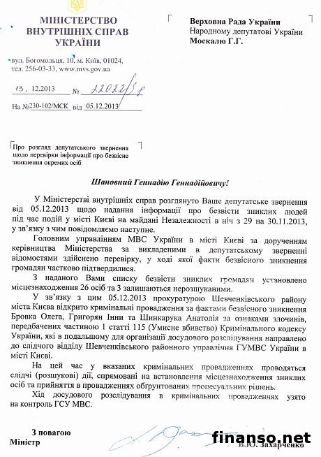 Насколько известно, после событий 30 ноября 2013 года в столице Украины Киеве – силового разгона активистов Майдана Незалежности – Министерство внутренних дел подтвердило факт пропажи без вести трех особ. Такой информацией с корреспондентами поделился народный депутат Верховной Рады Украины от фракции “Батькивщина” Геннадий Москаль. Официальный ответ МВД на запрос депутата о пропаже активистов.Оппозиционер Москаль, таким образом, обнародовал официальный ответ Министерства внутренних дел на его депутатский запрос о пропавших людях в соответствующие органы. Народный избранник сообщил: “На мое депутатское обращение в правоохранительные органы относительно пропавших на киевском Евромайдане в ночь с 29 на 30 ноября 2013 года людей МВД прислало ответ. Из списка граждан, предоставленного мной, было установлено местонахождение 26 человек, однако еще три личности по-прежнему остаются ненайденными”. Также парламентарий обнародовал имена и фамилии тех активистов, которых до сих пор не может найти милиция. “По его утверждению, это: Анатолий Шинкарук, Олег Бровка, а также Инна Григорян”, - пишет “Украинская правда”. Известно также, что в тексте ответа Министерства внутренних дел на официальный запрос народного депутата Украины Геннадия Москаля сообщается, что прокуратурой Шевченковского района Киева по факту исчезновения людей открыты уголовные производства, носящие признаки части 1 статьи 115 Уголовного кодекса Украины, которая предусматривает наказание за умышленное убийство. Эти уголовные производства были направлены сотрудникам следственного отдела Шевченковского районного управления Главного управления МВД столицы. Майдан разгоняли те же “беркутовцы”, что и под Киево-Святошинским райсудом.Согласно последним данным, благодаря настойчивости и отважности митингующих активистов, которые фактически заставили бойцов “Беркута” снять с лиц маски, было установлено, что избиением людей под районным судом в Киево-Святошинском районе занимались те же самые правоохранители, которые были опознаны во время силового разгона Майдана в Киеве в ночь на 30 ноября 2013 года. “Известно, что этот факт отметили активисты в социальных сетях”, - пишет главный редактор издания “Цензор.НЕТ” Юрий Бутусов. |