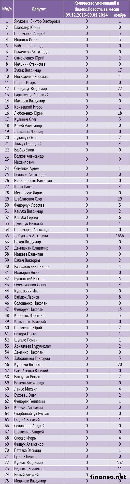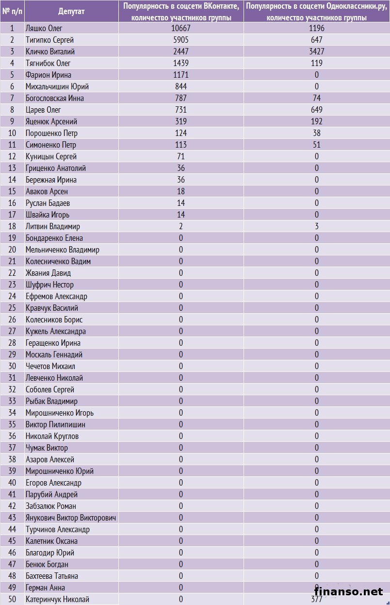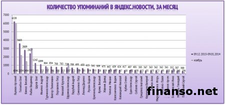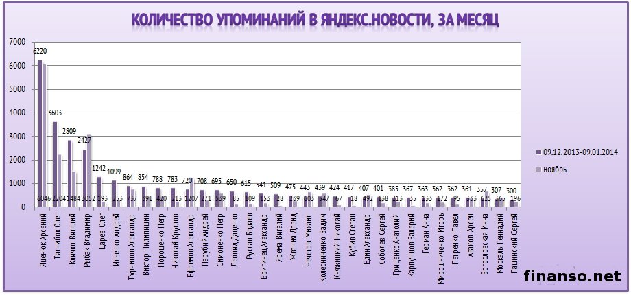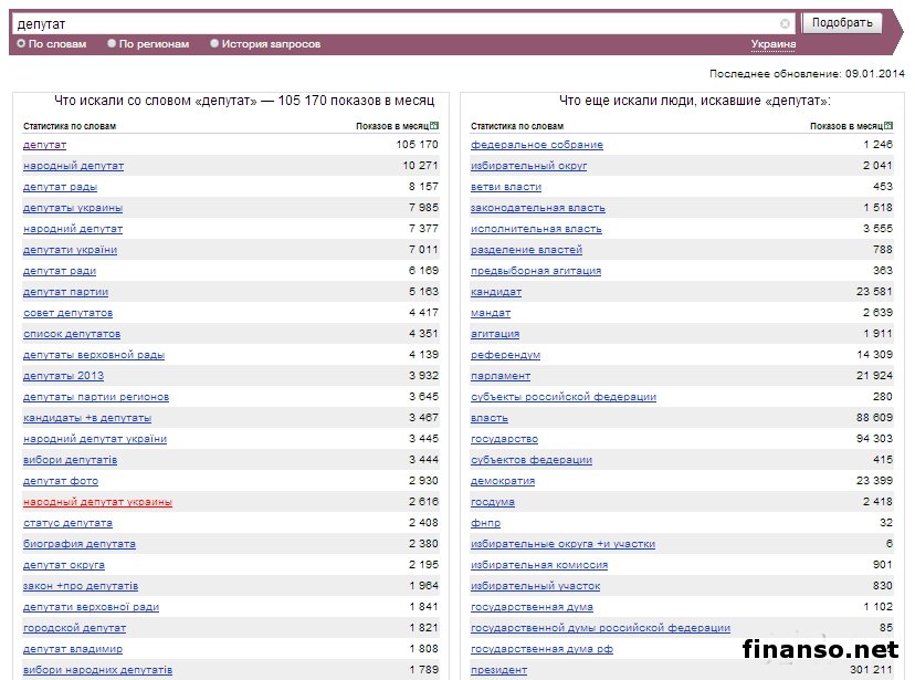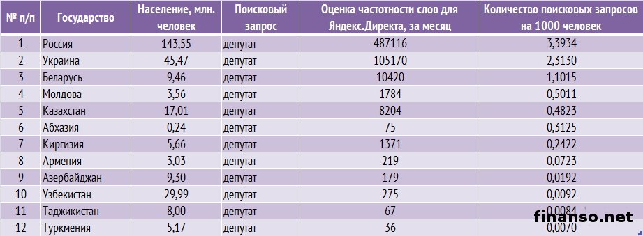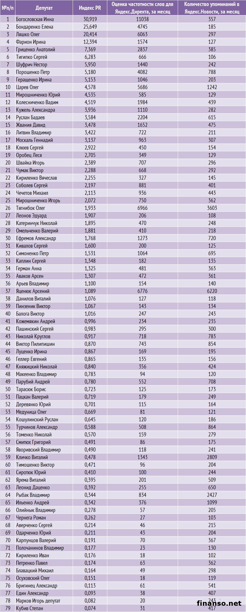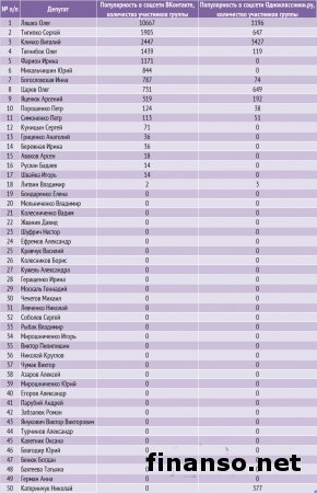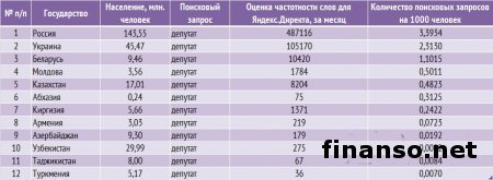 Какие же депутаты Верховной Рады Украины стали наиболее популярными среди украинцев в Яндексе в декабре, а также чьи пиар-кампании оказались самыми эффективными в этот период, выясняли аналитики издания для инвесторов "Украина сегодня: finanso.net". Наиболее популярным депутатом Украины в январе стала Инна Богословская.Рейтинг популярности украинских парламентариев составлялся на основе следующих критериев: - оценка частотности слов для Яндекс.Директа за месяц, рассчитываемая с помощью сервиса wordstat.yandex.ru; - частота упоминаний о депутатах ВР Украины в украинских интернет-изданиях, рассчитываемая при помощи агрегатора Яндекс.Новости (news.yandex.ru); - регион анализа (а значит, и поиска в сервисе wordstat.yandex.ru) – Украина. Первое место рейтинга популярности депутатов Украины заняла Инна Богословская (11 038 запросов украинцев в Яндексе за период с 9 декабря 2013 года по 9 января 2014 года). Новостными поводами о ней стали выход И. Богословской из "Партии Регионов", ее призывы к другим политикам покидать данную партию, а также разнообразные высказывания в отношении сложившейся политической ситуации в Украине. На второй позиции рейтинга популярности оказался Олег Тягнибок (6 966 запросов украинцев в поисковой системе Яндекс за месяц). Информационными поводами о нем стали заявления О. Тягнибока с просьбами не поддаваться на провокации, встреча депутата с послами иностранных государств и другие. Третью ступень рейтинга журнала для инвесторов "Украина сегодня: finanso.net" занял Арсений Яценюк (6 776 запросов украинцев в Яндексе за месяц). Новостными поводами о депутате стали его заявления об участии в предстоящих президентских выборах трех оппозиционных кандидатов, а также о необходимости функционирования Майдана до президентских выборов и другие. Малопопулярными в Яндексе в декабре оказались следующие украинские депутаты: - Купчак Владимир (1 запрос украинцев в Яндексе за период с 9 декабря 2013 года по 9 декабря 2014 года); - Курпиль Степан (1); - Парубок Емельян (1); - Пазиняк Василий (1); - Сыч Александр (1); - Бидевка Владимир (0); - Васюник Игорь (0); - Билый Алексей (0); - Медянык Владимир (0); - Деревляный Василий (0); - Хмиль Михаил (0); - Шкварилюк Владимир (0); - Котеляк Лидия (0). Изменения в популярности украинских парламентариев.Популярность депутатов подвержена влиянию огромного количества факторов – начиная непосредственно от их деятельности и заканчивая пиаром. Как же изменилась популярность депутатов Верховной Рады за период с ноября 2013 года по январь 2014 года? Исходя из данных представленной таблицы, можно сделать следующие выводы: - наибольший прирост популярности продемонстрировали Инна Богословская, Олег Тягнибок и Арсений Яценюк – на 7 902, 5 497 и 5 201 запросов украинцев в Яндексе соответственно за анализируемый период больше, чем за ноябрь; - наибольшее падение популярности показали Анжелика Лабунская, Ирина Фарион, Геннадий Зубко и Василий Кравчук – на 815, 374, 232 и 213 запросов украинцев в Яндексе соответственно за анализируемый период меньше, чем за ноябрь; - общий рост уровня популярности в декабре составил 83 процента (или 57 691 запрос). В каких странах депутатами интересуются чаще всего?Определить уровень заинтересованности жителей разных стран в информации о депутатах можно при помощи статистики поисковых запросов в wordstat.yandex.ru (при пересчете на 1 тысячу населения): Данн