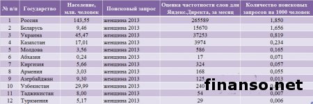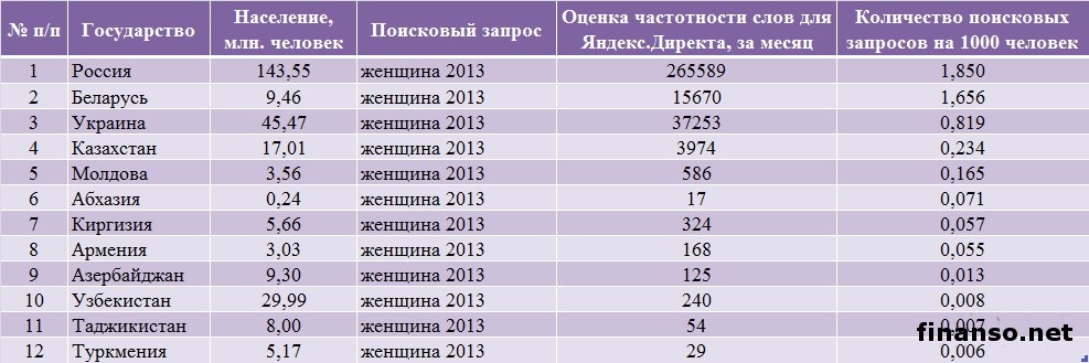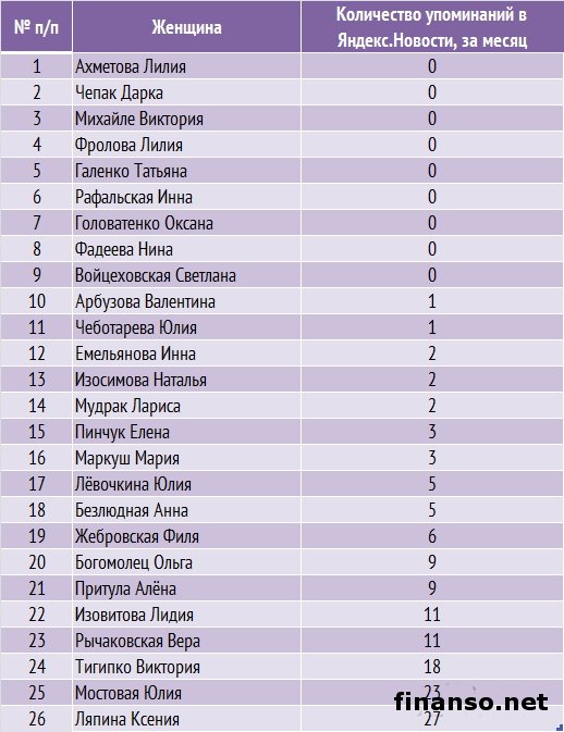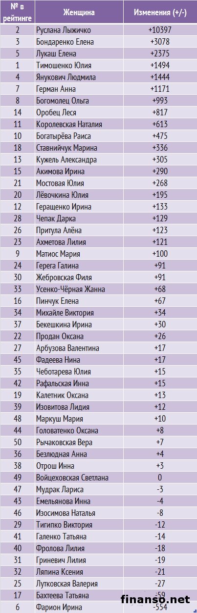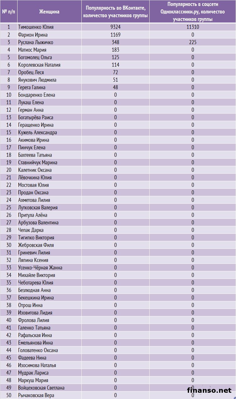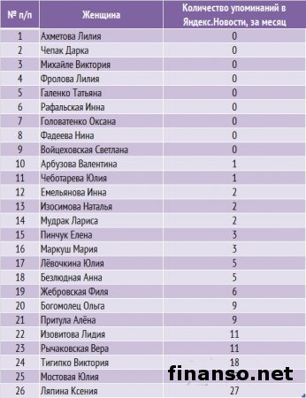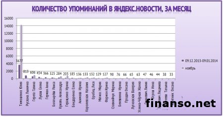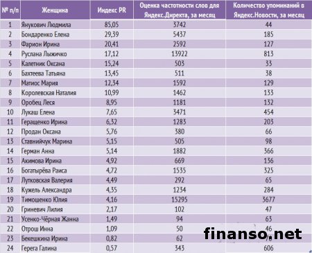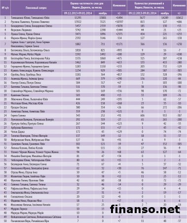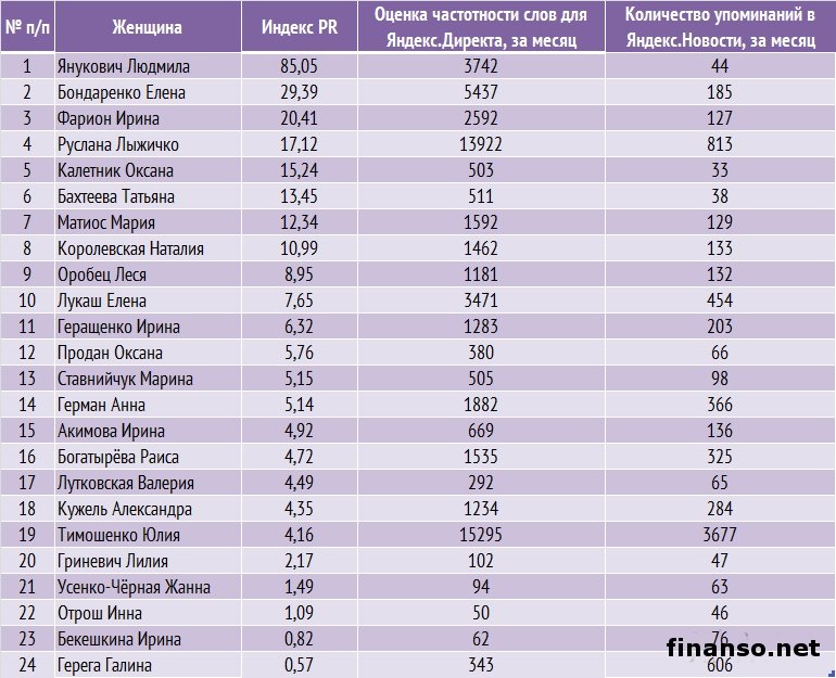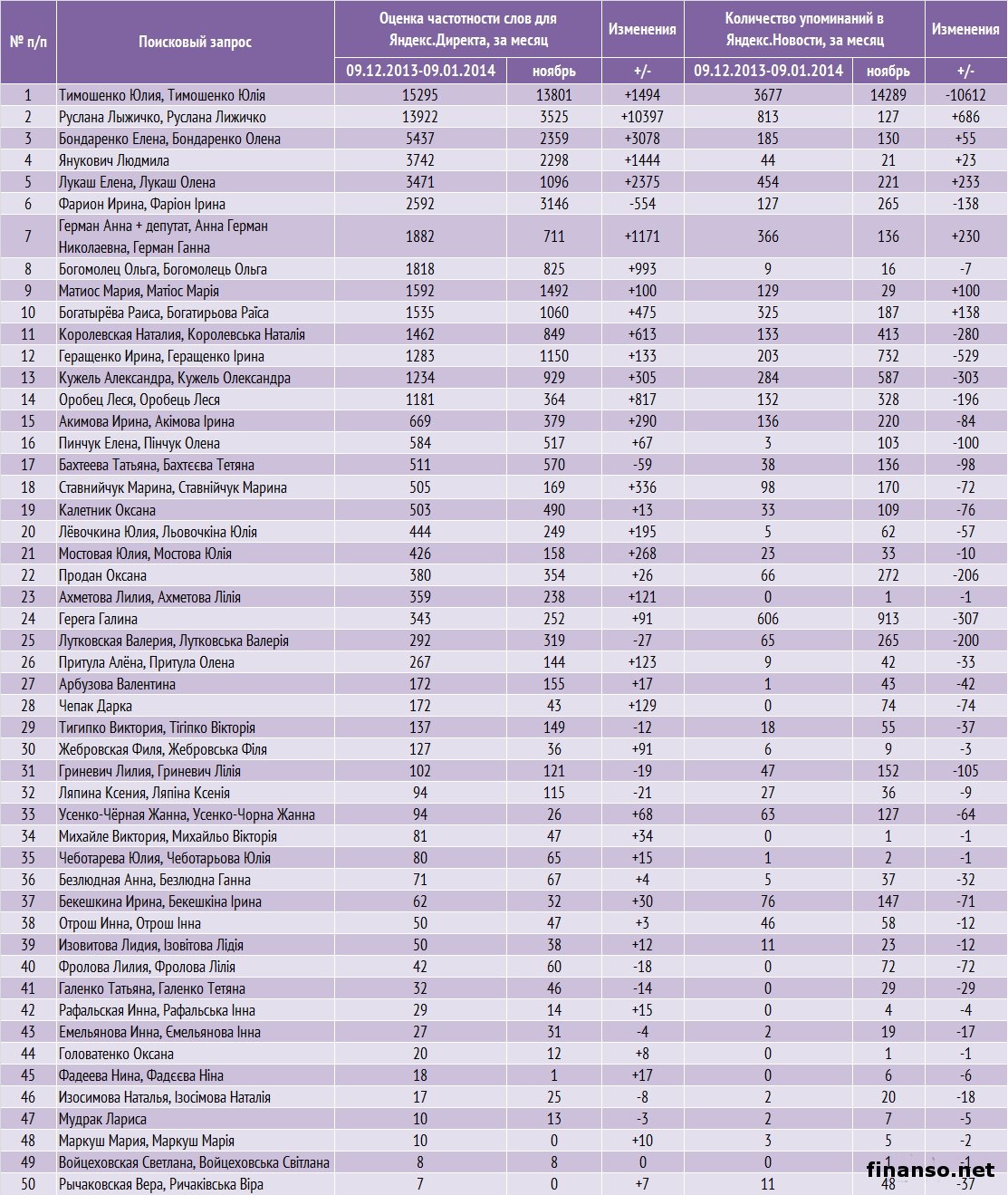 Какие же украинские женщины, представляющие сферы бизнеса, науки, политики, шоу-бизнеса, медиа-среды и спорта, являются не просто влиятельными, но и высокопопулярными среди жителей Украины, выясняли аналитики издания для инвесторов "Украина сегодня: finanso.net". Лидером рейтинга популярности стала Юлия Тимошенко.Базой для анализа популярности влиятельных украинок являлись следующие критерии: - оценка частотности слов (количественное выражение популярности 49-ти женщин, которые входят в список ТОП-100 наиболее влиятельных женщин Украины по версии издания "Фокус.ua", а также оказывающей сегодня большое влияние на украинцев Русланы Лыжичко) для Яндекс.Директа за месяц, расчет которой проводился при помощи сервиса wordstat.yandex.ru; - частота упоминаний о влиятельных украинках в электронных масс-медиа Украины, рассчитанная при помощи агрегатора Яндекс.Новости (news.yandex.ru); - регион анализа (а следовательно, и поиска в сервисе wordstat.yandex.ru) – Украина. Первую ступень рейтинга популярности заняла Юлия Тимошенко (15295 запросов украинцев в поисковой системе Яндекс за период с 9 декабря 2013 года по 9 января 2014 года). Информационными поводами о ней в украинских интернет-СМИ стали: вертеп под зданием больницы, где Ю. Тимошенко проходит курс лечения; поздравление экс-премьера с Рождеством; петиция с требованием освободить Ю. Тимошенко на сайте Белого дома и другие. Второе место рейтинга журнала для инвесторов "Украина сегодня: finanso.net" заняла Руслана Лыжичко (13922 запроса украинцев в Яндексе за месяц). Новостными поводами о ней стали: обращение с оскорблениями от имени Русланы к Ирине Фарион, на авторов которого сама Руслана собирается подавать в суд; победа львовского хора под руководством певицы и активистки Майдана Русланы в шоу "Битва хоров" и другие. Третье место рейтинга заняла Елена Бондаренко (5437 запросов украинцев в Яндекс за месяц). Новостными поводами о ней стали заявления Е. Бондаренко о том, что виновными в насилии против активистов Майдана является оппозиция, и о возможности заключения безвизового режима Украины с ЕС уже в 2014 году, а также многие другие. Не слишком популярными оказались следующие влиятельные украинки: - Фадеева Нина (18 запросов украинцев в Яндексе за период с 9 декабря 2013 года по 9 января 2014 года); - Изосимова Наталья (17); - Мудрак Лариса (10); - Маркуш Мария (10); - Войцеховская Светлана (8); - Рычаковская Вера (7). Как изменилась популярность влиятельных украинок?Резкие изменения в популярности публичных личностей могут вызывать различные события, происходящие в мире, а также действия самих публичных персон. Иногда изменения популярности остаются незначительными, но практически никогда популярность не остается стабильной из-за действия множества разнообразных факторов. Какие же изменения произошли в популярности украинских влиятельных женщин за период с ноября 2013 года по начало января 2014 года? Исходя из данных таблицы, можно сделать следующие выводы: - наибольший прирост популярности продемонстрировала Руслана Лыжичко (за анализируемый период украинцы запрашивали информацию о ней в Яндексе почти в четыре раза чаще, чем в ноябре); - наибольшее падение популярности показала Ирина Фарион (за анализируемый период украинцы запрашивали о ней в Яндексе на 554 раза меньше, чем за ноябрь); - общий рост популярности влиятельных украинок, представлен