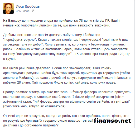 Как стало известно, вчера, 25 января 2014 года, на встречу с Президентом Украины Виктором Януковичем не пришли 78 народных депутатов Верховной Рады от Партии регионов. Об этом на своей страничке в социальной сети Facebook сообщила депутат, оппозиционер Леся Оробец. Корреспонденты издания “Украина сегодня: Finanso.net” рассказали более детально о таком заявлении Л. Оробец. К Януковичу не пришли 78 депутатов.Так, Леся Оробец написала: “На улицу Банковую на встречу к Виктору Януковичу не пришли аж 78 народных избранников от Партии регионов. А это вдвое меньше чем голосовали лапками за принятые 16 января “диктаторские законы”. Согласно мнению Оробец, разговоры о переформатировании Кабинета министров вызваны исключительно отсутствием у В. Януковича реального большинства в Верховной Раде. Также народный депутат Украины написала: “Что-то не совсем дотягивает до большинства, видимо, потому и начались все эти басни о "переформатирует". Сказки из тех же степей, что и беркутовские "разогнали бы вас в секунду, однако мы ведь хорошие". Но с другой стороны у ригов есть те, кого нет у беркутовцев – Рыбак и Олийнык”. Леся Оробец обратилась к парламентариям-регионалам с предложением, что действующий в Украине президент Виктор Янукович ведет их к худшему сценарию. Также Оробец предостерегла их: “Родственники и друзья убитых и раненых активистов, истязаемых на морозе, абсолютно ничего не боятся, а встают и желают одного – отомстить, ведь вы им другого выбора не оставили, своими свирепыми псами и судами”. Власть убеждает ПР проголосовать за введение ЧП в Украине.Также она призвала регионалов: “Это понять совсем же нетрудно, правда? И нет же никаких подписей в количестве 239 автографов под тем, что подписал спикер Владимир Рыбак и понес Виктору Януковичу, правда? И тем более этого не было в момент подписания, правда? Может пора уже публично сказать – я не голосовал, и никакую подпись не ставил?”. Насколько известно, в минувшую субботу, 25 января 2014 года, Президент Украины Виктор Янукович проводил встречу с депутатами от фракции Партии регионов. Депутаты-оппозиционеры, в свою очередь, заявили, что власть всячески пытается убедить своих депутатов проголосовать именно за введение чрезвычайного положения. При этом в ходе своего разговора с вице-президентом Соединенных Штатов Америки украинский лидер дал слово не вводить в Украине статус ЧП. |