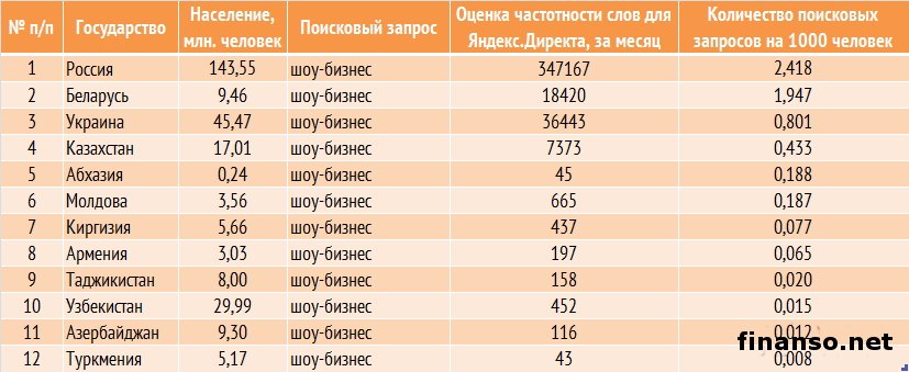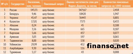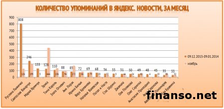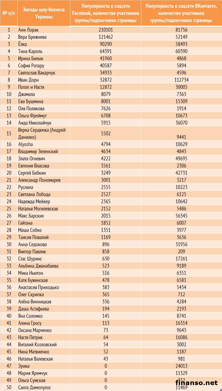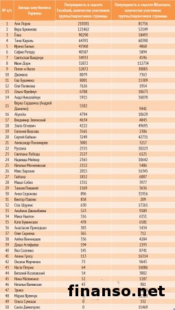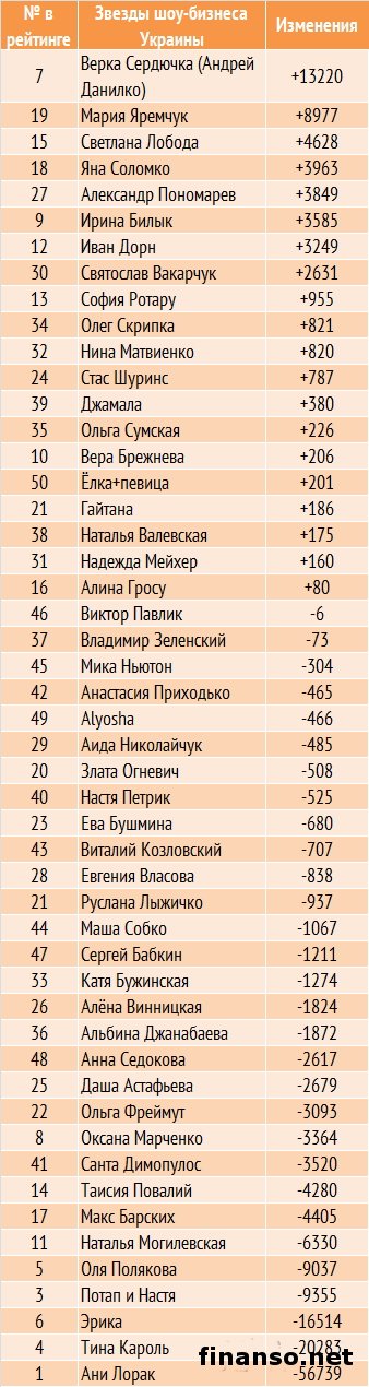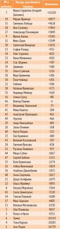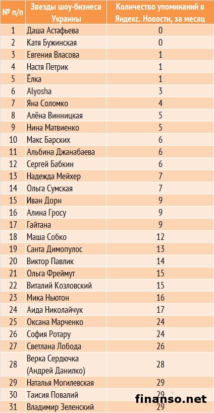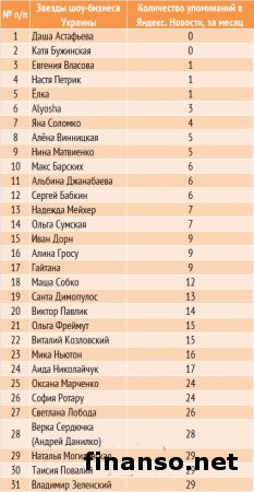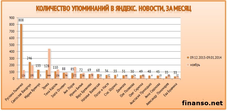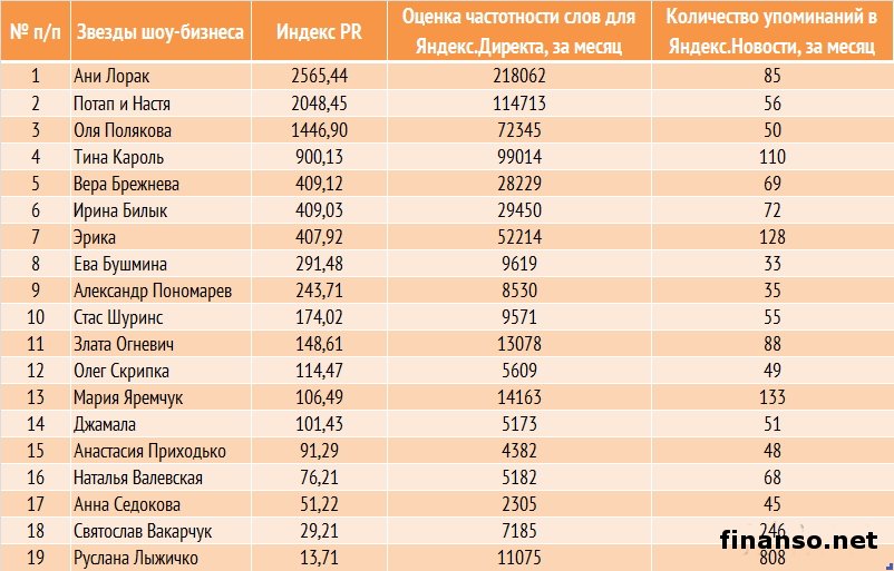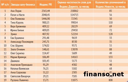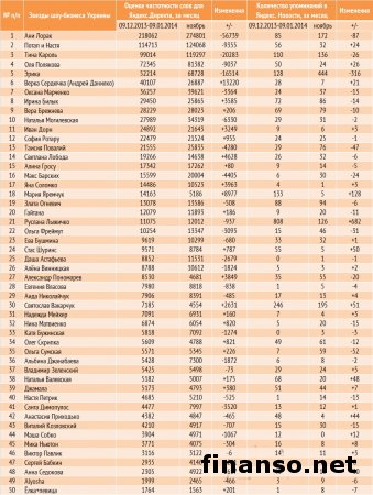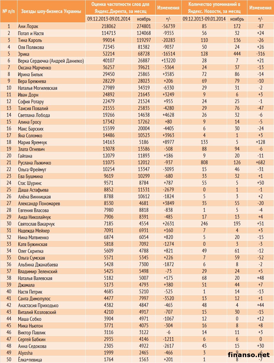 Многие украинские звезды эстрады, кино и другие сфер шоу-бизнеса являются популярными не только в Украине, но и далеко за ее пределами. Талант и эпатажность, яркость образа и непревзойденная харизма – все это привлекает к персонам творческого бомонда недюжинный интерес аудитории.Какие же звезды украинского шоу-бизнеса являются сегодня самыми популярными среди жителей Украины, разбирались аналитики журнала для инвесторов "Украина сегодня: finanso.net". Самая популярная звезда шоу-бизнеса Украины – Ани Лорак.Рейтинг популярности украинских звезд шоу-бизнеса составлялся на основе следующих критериев: - оценка частотности слов для Яндекс.Директа за месяц, рассчитанная с помощью сервиса wordstat.yandex.ru; - частота упоминаний о звездах шоу-бизнеса в украинских интернет-СМИ, рассчитанная при помощи агрегатора Яндекс.Новости (news.yandex.ru); - регион анализа (а значит, и поиска в сервисе wordstat.yandex.ru) – Украина. На первой ступени рейтинга популярности украинских знаменитостей сферы шоу-бизнеса оказалась Ани Лорак (218062 запроса украинцев в Яндексе за период с 9 декабря 2013 года по 9 января 2014 года). Информационными поводами о ней в СМИ стали "драка" Ани Лорак с Сергеем Лазаревым для промо-ролика к шоу "Голос страны"; рейтинг певицы в списке ТОП-звезд 2013 года по версии "Forbes" и другие. Второй в рейтинге популярности издания для инвесторов "Украина сегодня: finanso.net" оказались Потап и Настя (114713 запросов украинцев в Яндексе за месяц). Новостными поводами о них в СМИ стали занятое ими пятое место в рейтинге звезд украинского шоу-бизнеса по версии "Forbes"; высокие гонорары ТОП-звезд в новогоднюю ночь и другие. Третья позиция рейтинга досталась Тина Кароль (99014 запросов украинцев в Яндексе за месяц). Информационными поводами о ней в электронных изданиях стали дополнительный концерт в Киеве, выступление Тины Кароль на сцене Х-фактора и другие. Малопопулярными в Яндексе (UA) оказались следующие звезды украинского шоу-бизнеса: - Настя Петрик (4685 запросов в Яндексе за период с 9 декабря 2013 года по 9 января 2014 года); - Санта Димопулос (4477) - Анастасия Приходько (4382); - Виталий Козловский (4210); - Маша Собко (3904); - Мика Ньютон (3771); - Виктор Павлик (3116); - Сергей Бабкин (2935); - Анна Седокова (2305); - Alyosha (1999); - Ёлка (1764). Какие изменения произошли с популярностью украинских звезд шоу-бизнеса в декабре?Какими бы яркими, талантливыми и успешными не были представители шоу-бизнеса, их популярность никогда не будет стабильно высокой: способствовать росту популярности могут, например, интересные проекты, в которых они принимают участие, а снижению популярности – отсутствие резонансных новостных поводов о них. Как же изменилась популярность звезд украинского шоу-бизнеса с ноября 2013 года по январь 2014? По данным представленной таблицы можно сделать следующие выводы: - наибольший прирост популярности в декабре продемонстрировал Андрей Данилко (на 13220 запросов украинцев в Яндексе за анализируемый период больше, чем за ноябрь); - наибольшее (и серьезное) падение популярности показали Эрика (на 16514 запросов меньше), Тина Кароль (на 20283 запроса меньше) и лидер рейтинга Ани Лорак (на 56739 запросов меньше); - в целом заинтересованность украинцев в информации о звездах шоу-бизнеса, представленных в рейтинге, значительно снизилась: с 9 декабря 2013 года по 9 января 2014 года жители Украины запрашивали в Яндексе о знаменитост