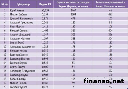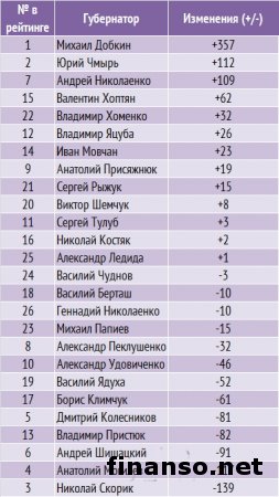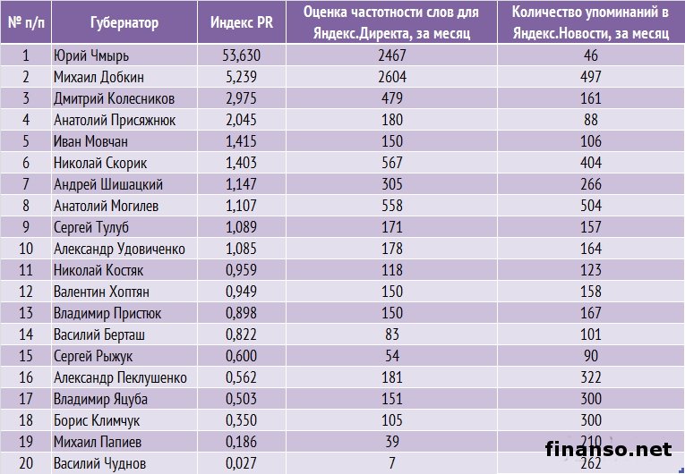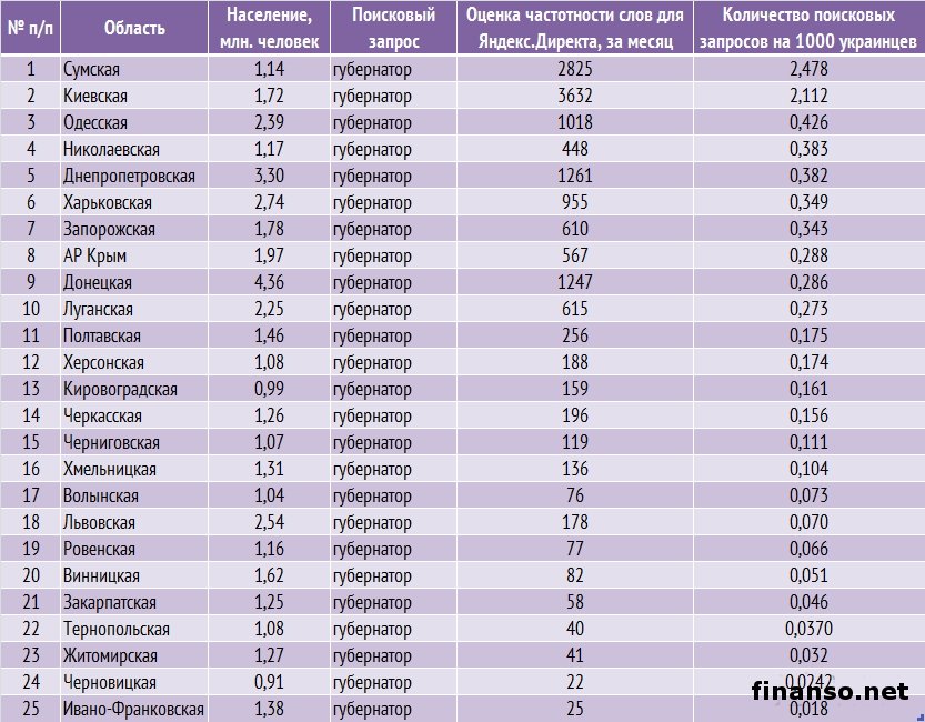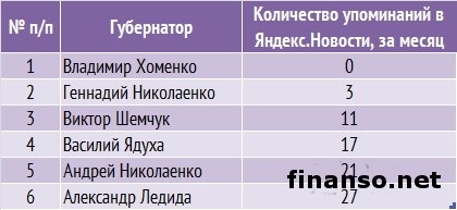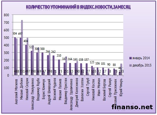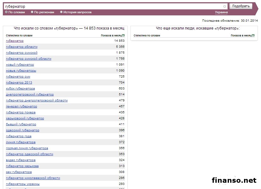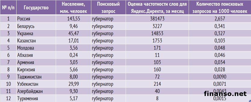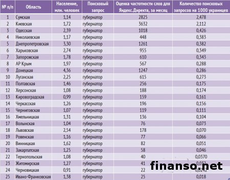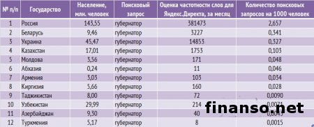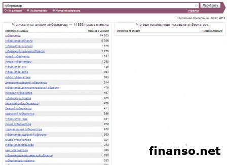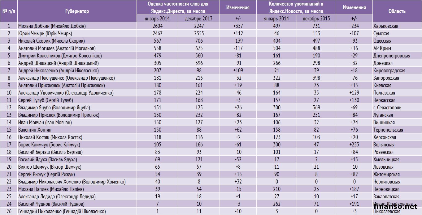 Какими же губернаторами украинцы интересовались в январе чаще всего, и как за месяц изменилась популярность каждого из украинских губернаторов в Яндексе, выясняли аналитики журнала для инвесторов "Украина сегодня: finanso.net". Лидером по популярности в январе стал Михаил Добкин.Рейтинг популярности губернаторов Украины формировался на основании следующих критериев: - оценка частотности слов для Яндекс.Директа за январь, расчет которой осуществлялся при помощи сервиса wordstat.yandex.ru; - частота упоминаний о губернаторах в украинских электронных изданиях, рассчитанная при помощи агрегатора Яндекс.Новости (news.yandex.ru); - регион анализа (таким образом, и поиска в сервисе wordstat.yandex.ru) – Украина. Первую позицию рейтинга популярности занял губернатор Харьковской области Михаил Добкин (2 604 запроса украинцев в Яндексе за январь). Новостными поводами о нем в СМИ Интернета (UA) стали: сессия харьковского облсовета, на которую М. Добкин и представители Партии регионов пришли в футболках с символикой спецподразделения "Беркут"; комментарии Михаила Добкина об отставке премьер-министра Николая Азарова и другие. На второй ступени рейтинга издания для инвесторов "Украина сегодня: finanso.net" оказался губернатор Сумской области Юрий Чмырь (2 467 запросов украинцев в поисковой системе Яндекс за месяц). Одним из наиболее ярких информационных поводов о нем в январе стало известие о возможности назначения Ю. Чмыря на должность главы Администрации президента. Замкнул тройку лидеров губернатор Одесской области Николай Скорик (567 запросов украинцев в Яндексе за январь). Новостными поводами о нем в интернет-СМИ стали его комментарий по поводу отставки Николая Азарова; перекрытие входа в одесскую обладминистрацию бетонными блоками и другие. Аутсайдерами по популярности в Яндексе оказались следующие губернаторы: - Владимир Хоменко (40 запросов украинцев в Яндексе за январь); - Михаил Папиев (39); - Александр Ледида (19); - Василий Чуднов (7); - Геннадий Николаенко (1). Как изменилась популярность украинских губернаторов в начале 2014 года?Популярность любого политика не может постоянно быть стабильной. Под действием тех или иных факторов она может то быстро расти, то стремительно падать: Исходя из данных представленной таблицы, можно сделать следующие выводы: - наибольший прирост популярности продемонстрировал Михаил Добкин – в январе 2014 года украинцы запрашивали о нем в Яндексе на 357 раз больше, чем в декабре 2013 года; - наибольшее падение популярности показал Николай Скорик – в январе 2014 жители Украины запрашивали о нем в поисковой системе Яндекс на 139 раз меньше, чем в декабре прошлого года; - общий прирост популярности украинских губернаторов с декабря 2013 года по январь 2014 года оказался небольшим – менее 1-го процента (или 30 запросов). Жители каких стран СНГ чаще всего ищут информацию о губернаторах в Яндексе?При помощи сервиса wordstat.yandex.ru можно проанализировать уровень заинтересованности жителей тех или иных государств в информации о губернаторах. При этом данные статистики учитываются в пересчете на 1 тысячу населения: Таким образом, можно выделить следующие факты: - наибольшую заинтересованность в информации о губернаторах проявляют жители РФ – на 1000 россиян пришлось 2,66 запроса в Яндексе за январь; - приблизительно одинаково (и достаточно редко) интересовались губерна