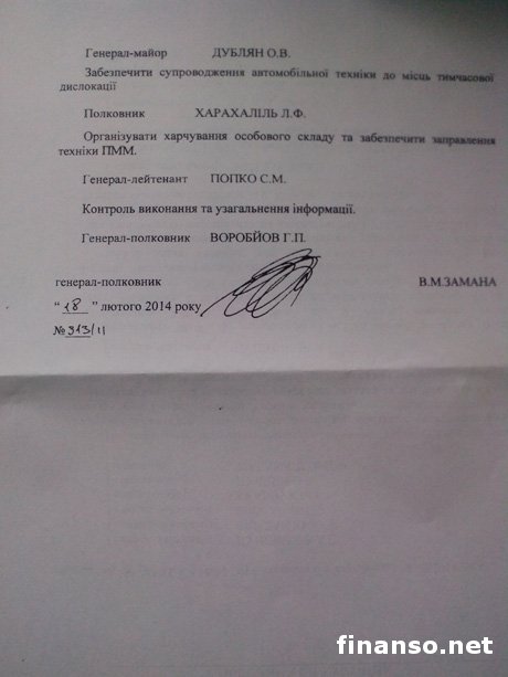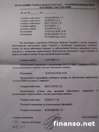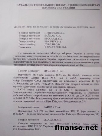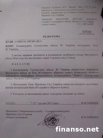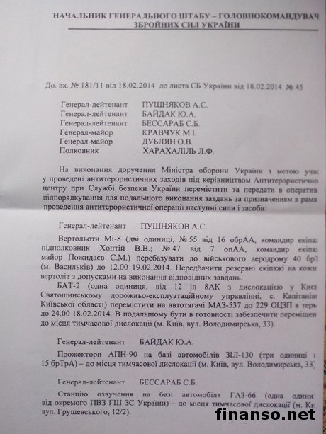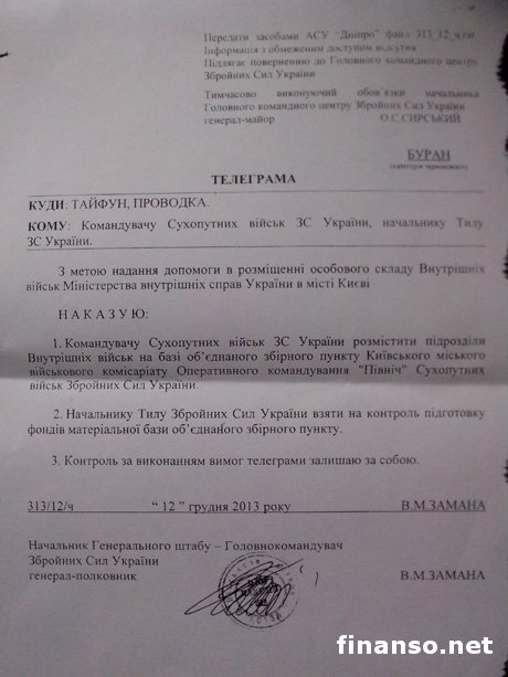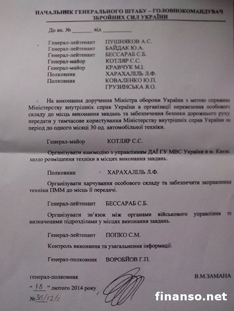 Есть предположение, что бороться с демонстрантами Вооруженные силы Украины оказывали помощь сотрудникам Министерства внутренних дел. «Украинская правда» располагает соответствующими подтверждающими документами.Милицию снабжали военной техникой.Имеется информация, что Главнокомандующий Вооруженных сил Украины генерал-полковник Владимир Замана подписал документ, военное министерство снабжало милицию военной техникой, транспортировало и размещало военнослужащих. Приказом от 12 декабря 2013 года было решено разместить подразделения внутренних войск на базе объединенного сборного пункта Киевского городского комиссариата Оперативного командования Север Сухопутных войск Вооруженных сил Украины. Этот приказ был отправлен телеграммой на имя командующего сухопутных Вооруженных сил Украины. Приказ от 18 февраля № 313/12/2 регламентировал представление Министерству внутренних дел 30-ти единиц автомобилей для транспортировки личного состава с целью обеспечения безопасности на дорогах. Два вертолета Ми-8 с резервными экипажами и одного БАТ-2 были предназначены для перебазирования их в город Васильков в рамках антитеррористических акций. 18 февраля был отдан приказ о предоставлении милиции одной станции озвучки и трех прожекторов на грузовиках. В период с 10-14 февраля планировалось перебазирование подразделений десантных войск Вооруженных сил Украины, с пометкой для проведения учений. При этом в Министерство обороны утверждали, что Вооруженные силы Украины не должны были вмешиваться в политический конфликт. Как передают корреспонденты «Украина сегодня: Finanso.net», в Министерстве обороны не один раз уверяли, что ВСУ не будут вмешиваться в конфликт. Неугодного командующего уволили. Виктор Янукович сменил начальника Генерального штаба - Главнокомандующего Вооруженных сил Украины: уволил генерал-полковника Владимира Заману и назначил Юрия Ильина. О готовности применить силу к радикально настроенным протестующим Министерство обороны заявило 20 февраля. Источники «Украинской правды» говорят о том, что Ильин сразу приказал воинские подразделения отправить для разгона демонстрантов. Тогда как Владимир Замана отказался ранее выполнить этот приказ, что и явилось причиной его отставки. Планировалось привлечь к ликвидации Майдана около 2,5 тысячи военных, им предусматривалось предоставление широких полномочий, даже применение специальных средств и оружия. |