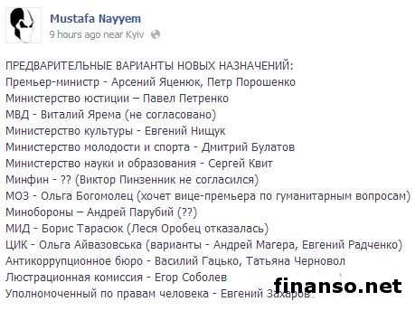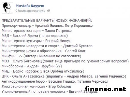 Список кандидатур для нового правительства уже почти согласован новой властью, но экс-премьер Ю.Тимошенко выразила мнение, что большинство министерских портфелей нужно отдать Совету Майдана, о чем пишет издание “Коммерсант-Украина”.
