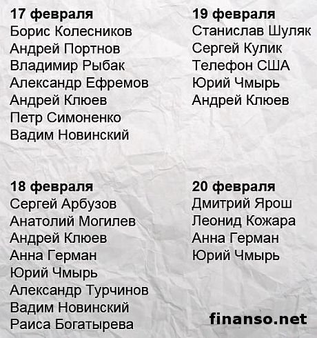 Как стало известно, к четвертому президенту Украины Виктору Януковичу накануне обострения противостояния между правоохранителями и активистами Майдана в Киеве приходили председатель и замглавы Администрации президента Андрей Клюев и Андрей Портнов соответственно. Кроме того, к тогда еще главе государства также наведывался и Александр Ефремов, лидер фракции Партии регионов. Информация об этом была опубликована в одном из украинских онлайн-изданий - Телеканал новын "24".Кто еще приходил в гости к Януковичу накануне кровавой смертельной бойни на Майдане, разбирались корреспонденты издания “Украина сегодня: Finanso.net”. Стоит также сообщить, что, в соответствии с данными украинского журналиста Мустафы Найема, к Виктору Януковичу 17 февраля текущего года приходили народные депутаты Верховной Рады Украины от Партии регионов – Вадим Новинский, Борис Колесников, лидер Коммунистической партии Петр Симоненко и тогдашний спикер парламента Владимир Рыбак. Так, в феврале месяце текущего 2014 года, а именно 18 и 19 числа, в то время, когда сотрудники силовых структур Украины буквально десятками убивали активистов Евромайдана в Киеве, на приеме у тогда еще главы государства Виктора Януковича побывал тогдашний исполняющий обязанности премьер-министра Украины Сергей Арбузов, советник президента Анна Герман, уже экс-глава Администрации президента Андрей Клюев, бывший руководитель Совета министров Крыма Анатолий Могилев, народный депутат Украины от партии “Батькивщина”, оппозиционер Александр Турчинов, Юрий Чмырь, который тогда занимал пост заместителя главы АП, экс-глава Министерства здравоохранения Раиса Богатырева, парламентарий, “регионал” Вадим Новинский, начальник Государственной службы охраны Сергей Кулик, а также командующий внутренними войсками Станислав Шуляк. В то время Януковичу звонили из США.Также сообщим, что к четвертому президенту Украины Виктору Януковичу накануне подписания соглашения об урегулировании в государстве кризиса, в четверг, 20 февраля текущего года, ходили экс-глава Министерства иностранных дел Украины Леонид Кожара, советник тогда еще руководителя страны Анна Герман, лидер организации, входящей в состав самообороны Майдана “Правый сектор” Дмитрий Ярош, а также заместитель главы Администрации президента Юрий Чмырь. |