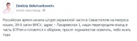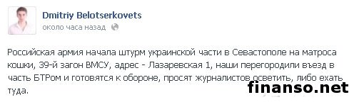 Кроме того, депутат рассказал о некоторых подробностях штурма. По его словам, одного из украинских офицеров-парламентариев взяли в плен, а в одном из зданий, которые находятся на территории части, начался пожар. Также он сообщил о том, что российский КамАЗ без опознавательных знаков ворвался на территорию военного городка через КПП. Армия Украины БТРом переговорила въезд, и таким образом отрезала КамаАЗ от остальных военных сил, которые остались вне периметра. В то же время депутат сообщил о том, что россияне выставили за пределами городка автоматчиков, которые угрожают начать стрельбу, а также о том, что была слышна автоматная очередь с территории военной части. По его словам, в настоящее время из КамАЗа никто не выходит. Блокировка самолетов РФ.Отметим, что другой парламентарий, Александр Бригинец, сообщил о том, что все возможные места посадки российских самолетов на территории Украины будут заблокированы грузовиками. Уже по традиции об этом было сказано на его странице в социальной сети Facebook. Он написал, что Украина превращает все возможные места посадки самолетов Российской Федерации в места парковки бензовозов. Напомним о том, что сегодня, 2 марта в Феодосии батальон морской пехоты ВМС Украины был заблокирован вооруженными людьми и казаками, и им был поставлен ультиматум – военные должны сложить оружие. Военные сообщили о том, что им приказали сложить оружие до 10 утра или начнется штурм батальона, они также призвали представителей СМИ прибыть на место расположения батальона для того, чтобы зафиксировать вооруженное нападение на воинское подразделение. В связи с тем, что ситуация в Украине накаляется, на сегодняшнем закрытом заседании Верховной Рады может решиться вопрос о введении чрезвычайного или военного положения в Украине в связи с вводом войск Российской Федерации на территорию страны, о чем рассказал Руслан Кошулинский, вице-спикер парламента. |