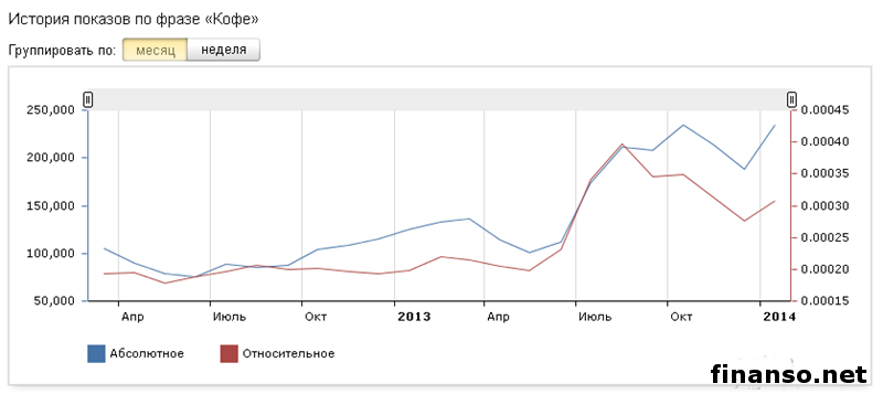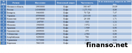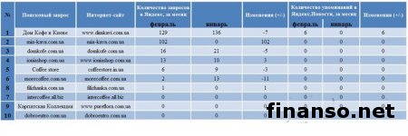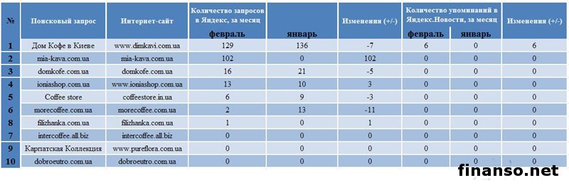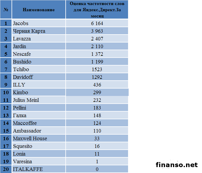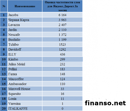 Кофе, несомненно, является очень популярным напитком в Украине. Датой его появления в государстве принято считать 1665 год - время правления Алексея Михайловича, времена, когда Украина была частью Русского государства.Кофе выращивают для реализации почти в 60 странах. В пяти из них – Индонезии, Вьетнаме, Индии и Бразилии – производят ориентировочно 70 процентов всего мирового объема кофе. Значительное место исторической родины кофе занимает Эфиопия. Существуют два основных сорта кофе – робуста и арабика. В мировом производстве часть арабики составляет приблизительно 75 процентов. Категория кофе является одной из самых стабильных на рынке товаров повседневного спроса. Лояльность к бренду здесь очень большая, так как потребители откажутся от обычной марки и перейдут на более дешевую только в крайнем случае. Какие же самые известные бренды кофе и его интернет-продавцы пользуются самым большим успехом у жителей Украины, разбирались аналитики издания «Украина сегодня: Finanso.net». Согласно данным таблицы, наиболее известными брендами кофе среди украинских граждан стали: - Jacobs – 6164 запроса в Яндексе за февраль, которые сделали жители украинского государства; - Lavazza – 2407 запросов; - Jardin – 2110 запросов; - Nescafe – 1372 запроса; - Davidoff – 1292 запроса. Стоить отметить что, Jacobs – марка кофе, которая была основана в Германии предпринимателем Иоганном Якобсом еще в 1895 году. Кофе данного бренда отличается высоким качеством и экологичным выращиванием разных сортов напитка, что значительно повышает известность данной марки. Также в десятку самых известных брендов кофе вошли: - Tchibo – 1523 запроса в Яндексе; - Bushido – 1199 запросов; - Черная Карта – 499 запросов; - ILLY – 436 запросов; - Kimbo – 299 запросов. Аутсайдерами рейтинга стали такие марки популярного напитка, по которым было произведено менее ста запросов: - Maxwell House – 33 запроса; - Squesito – 16 запросов; - Lonia – 11 запросов; - Varesina – 1 запрос; - ITALKAFFE – 0 запросов. Рейтинг популярности интернет-магазинов, продающих кофе в Украине, за февраль 2014 года.Рейтинг составляется на основании двух прозрачных и объективных показателей, которые помогут при выборе компании. Это: - число вводимых запросов в поисковую систему Яндекс за месяц (регион поиска – Украина); - число упоминаний той или иной компании в СМИ, то есть в интернет-изданиях агрегатора новостей Яндекс.Новости. - Первое место по известности среди интернет-магазинов, продающих кофе, занимает «Дом кофе в Киеве», поскольку по нему было произведено самое большое количество запросов (129) в поисковой системе Яндекс. Поскольку специалисты данного предприятия могут помочь разобраться в кофейных терминах, сориентироваться во многообразии представленных кофейных аппаратов, подобрать вкусный сорт кофе, необходимый аксессуар и многое другое. - Второе место заняла «Mia kava» со 102 запросами в Яндексе. Это интернет-магазин, продающий оригинальный кофе по самым низким ценам. При заказе от 300 гривен доставка по Украине бесплатная. Действует гибкая система бонусов для постоянных клиентов. - Третье место занимает «Дом кофе», по которому жители Украины произвели 16 запросов в поисковой системе Яндекс за последний месяц. Это сеть специализированных магазинов по продаже кофе швейцарской фирмы Blaser и кофейного оборудования ведущих мировых производителей. С помощью сервиса «Яндекс.Директ» аналит