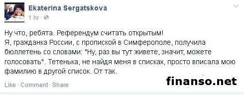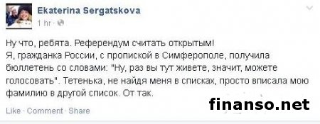 Она написала, что референдум можно считать открытым, и она, как гражданка Российской Федерации с пропиской в Симферополе, получила бюллетень. Это ей объяснили словами: «Раз вы здесь проживаете, значит, можете проголосовать». А на избирательном участке, не найдя журналистку в списке, ее фамилию просто вписали в другой список. Проведение референдума.Напомним, что сегодня в 8 часов утра по Киевскому времени начался референдум об определении дальнейшего статуса Автономной Республики Крым. Участки для голосования будут вести свою работу с 8:00 до 20:00 по киевскому времени. В настоящее время на территории Крыма свою работу проводит 1205 избирательных участков, также у определенной категории жителей автономии есть возможность проголосовать на дому. В общей сложности, в списках избирателей находилось 1 миллион 515 тысяч человек, из которых, по мнению правительства АРК, на избирательные участки придет около 80%. За проведением данного референдума следит 135 наблюдателей из различных стран, в числе которых Россия, Латвия, Бельгия, Китай, Монголия, Польша, Сербия, Франция, Испания, Греция и многие другие. Отметим, что этот референдум был признан нелегитимным в Конституционном суде Украины, куда подал соответствующее обращение и.о. президента Александр Турчинов. Кроме того, он был не признан международным сообществом, в том числе Европейским Союзом, США и представителями Венецианской комиссии. Позже, 15 марта на рассмотрение Совета безопасности ООН была внесена резолюция, которой предусматривается объявление предстоящего референдума в Крыму не имеющим силы, и призвать мировое сообщество не признавать его результатов. Но Российская Федерация, воспользовавшись правом наложения вето, заблокировала эту резолюцию. На сегодняшний день в Крыму продолжают находиться вооруженные люди, которые блокируют украинские воинские части и другие ключевые объекты. |