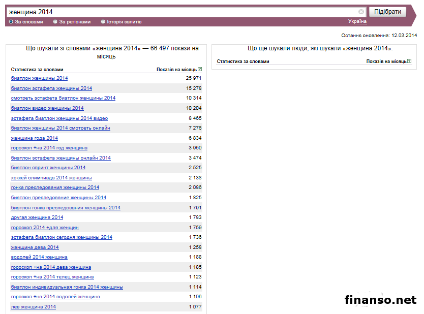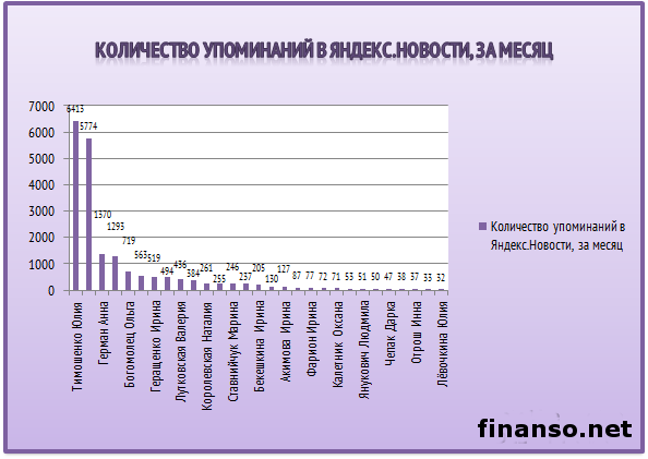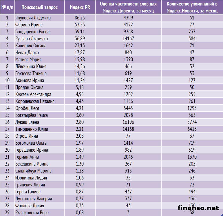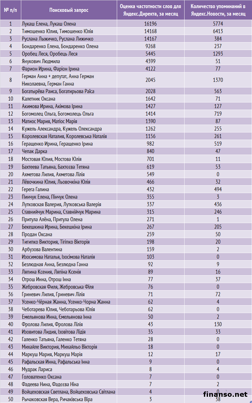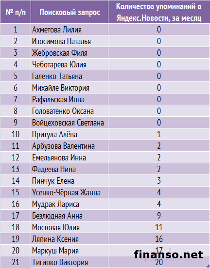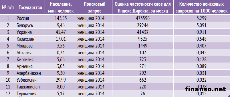 Какие украинки сфер спорта, политики, бизнеса, науки и шоу-бизнеса обладают помимо влиятельности также высокой популярностью среди жителей Украины, разбирались аналитики журнала для инвесторов "Украина сегодня: finanso.net". В ТОП-3 рейтинга популярности вошли Е. Лукаш, Ю. Тимошенко, Р. Лыжичко.Основными критериями, необходимыми для формирования рейтинга популярности влиятельных украинок, выступали следующие: - оценка частотности слов для Яндекс.Директа за месяц, рассчитываемая с помощью сервиса wordstat.yandex.ru; - количество упоминаний о влиятельных украинках в интернет-изданиях Украины, расчет которой проводился при помощи агрегатора Яндекс.Новости (news.yandex.ru); - регион анализа (а следовательно, и поиска в сервисе wordstat.yandex.ru) – Украина; - период анализа – с 20 января по 20 февраля 2014 года; - анализ проводился для 49-ти женщин, входящих в ТОП-100 наиболее влиятельных женщин Украины по версии издания "Фокус.ua", а также для Русланы Лыжичко (как одной из самых влиятельных на сегодняшний день украинок). Первое место по популярности заняла Елена Лукаш – о ней украинцы запрашивали в Яндексе более 16 тысяч раз за анализируемый период. Чаще всего СМИ Интернета упоминали о ней в контексте событий на Евромайдане и развития переговорных процессов Украины с Россией, Европой и Америкой. Вторую позицию рейтинга заняла Юлия Тимошенко (14 168 запросов украинцев в поисковой системе Яндекс за период с 20 января по 20 февраля 2014 года). Одним из наиболее ярких информационных поводов о ней за анализируемый период стало ее заявление о необходимости прекращения переговорного процесса с В. Януковичем. Третью ступень рейтинга популярности заняла Руслана Лыжичко – количество запросов украинцев о ней в Яндексе за месяц составило 14 167 раз. Наиболее ярким новостным поводом о ней в Яндекс.Новости стало ее объявление о голодовке в случае, если ЕС не введет санкции против украинских властей. Малопопулярными в Яндексе оказались следующие украинки: - Рафальская Инна (9 запросов украинцев в Яндексе за период с 20 января по 20 февраля 2014 года); - Мудрак Лариса (8); - Головатенко Оксана (7); - Фадеева Нина (7); - Войцеховская Светлана (4); - Рычаковская Вера (3). Жители каких государств наиболее часто интересуются современными женщинами?Чтобы выяснить, в каких странах СНГ современные женщины вызывают наибольшую заинтересованность населения, необходимо воспользоваться статистическими данными сервиса wordstat.yandex.ru, при этом пересчитывая показатели в расчете на 1000 населения: По данным представленной таблицы можно сделать следующие выводы: - чаще всего современными женщинами интересуются жители России и Беларуси – на 1000 населения там пришлось 3,3 и 3 запроса в Яндексе за месяц соответственно; - жители Украины интересуются современными женщинами значительно реже – на 1 тысячу украинцев приходится 0,9 запроса в Яндексе за месяц; - наименьшую заинтересованность в информации о современных женщинах проявили жители Армении, Азербайджана, Узбекистана, Таджикистана и Туркмении – на 10 тысяч населения там пришлось менее 1-го запроса. Какую именно информацию, связанную с современными женщинами, ищут украинцы?С помощью сервиса wordstat.yandex.ru можно определить, какую именно информацию ищут жители Украины при вводе в поисковую строку Яндекса запроса "женщина 2014": Данные сервиса wordstat.yandex.ru демонстрируют, таким образом, ч
