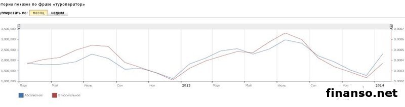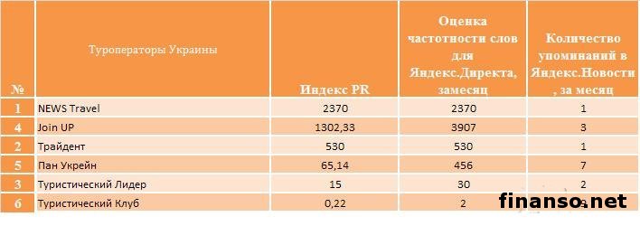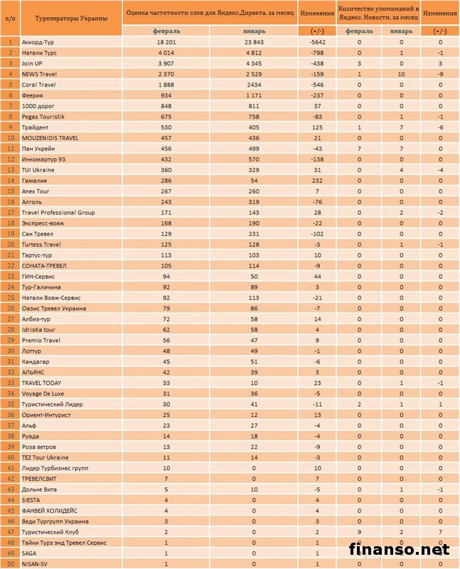 Отдых и расслабление играют значительную роль в жизни каждого современного человека. Этот аспект в жизни должен занимать такое же по значению место, как и семья, финансы, работа и тому подобное. Чтобы жизнь била ключом, нужно вовремя давать отдыхать своему уму и телу. Иногда полезно забыть обо всем на свете, делать что-то просто так, ради своего удовольствия.Поехать на отдых в другую страну в качестве туриста сейчас довольно просто и легко. Можно обратиться в турагентство, которых в наше время большое количество в любом городе, заполнить некоторые бумаги и поставить пару подписей, или даже просто зайти на сайт понравившегося туроператора и заполнить стандартную анкету. Но как выбрать наиболее подходящее турагентство, которое сможет удовлетворить все ваши запросы? В связи с этим аналитики журнала для инвесторов "Украина сегодня: finanso.net" разбирались, какие туроператоры Украины стали самыми популярными в феврале текущего года. Аккорд-Тур стал самым популярным среди жителей Украины в поисковой системе Яндекс.Основой для проведения анализа известности украинских туроператоров стали два показателя: - оценка частотности слов для Яндекс.Директа за месяц, рассчитываемая с помощью сервиса wordstat.yandex.ru; - частота упоминаний об украинских туроператорах в интернет-СМИ Украины, расчет которой проводился при помощи агрегатора Яндекс.Новости (news.yandex.ru); - регион анализа – Украина. Первую позицию в рейтинге занял туроператор Аккорд-Тур, по которому украинцы в поисковой системе Яндекс в феврале сделали 18 201 запрос. Компания предлагает самые разнообразные туры как по Украине, так и по зарубежным странам. При этом учитывает всевозможные запросы клиентов и может удовлетворить требования даже самых «капризных» клиентов. На втором месте оказался туроператор Натали Турс, с показателем 4 014 запросов в Яндексе. Компания Натали Турс Украина на протяжении многих лет весьма успешно работает в сфере туристических услуг и предоставляет своим клиентам сервис высшего качества, а также различные туры по странам Европы и мира. Персонал турагентства состоит из квалифицированных сотрудников, которые обеспечивают наивысшее качество обслуживания и индивидуальный подход к каждому клиенту. Третье место занял туроператор Join UP, по которому граждане Украины в феврале месяце сделали 3 907 запросов в поисковой системе Яндекс. В наличии компании свыше тридцати своих операторских направлений почти во все уголки земного шара. Компания активно развивается и укрепляет свою позицию стабильного и надежного туроператора, предлагающего туристический продукт наивысшего качества. В десятку лидеров также вошли такие туроператоры: - NEWS Travel - 2 370 запросов в Яндексе в феврале; - Coral Travel - 1 888 запросов; - Феерия – 934 запроса; - 1000 дорог – 848 запросов; - Pegas Touristik – 675 запросов; - Трайдент – 530 запросов; - MOUZENIDIS TRAVEL – 457. Аутсайдерами рейтинга стали следующие туроператоры, по которым жители Украины произвели самое меньшее количество запросов в поисковой системе Яндекс: - Тайки Турз энд Тревел Сервис – 1 запрос; - SAGA – 1 запрос; - NISAN-SV – 1 запрос. Какие изменения произошли в популярности украинских туроператоров в феврале?Популярность туроператоров зависит от достаточно большого количества факторов. Первым критерием, по которому люди выбирают туроператора, является цена. Конечно же, покуп