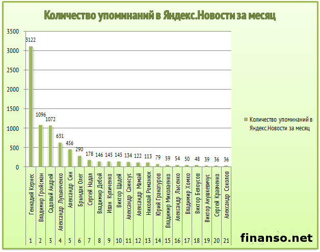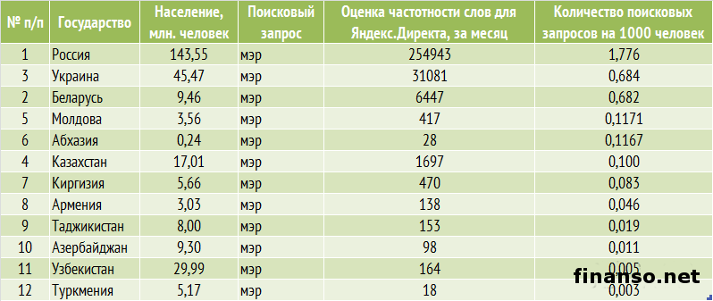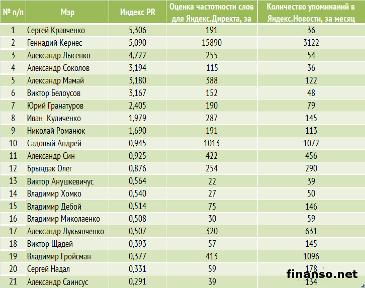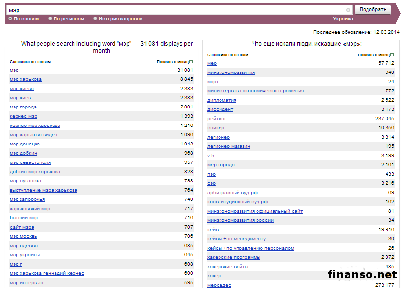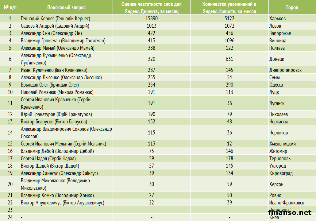 Мэр любого города вместе с приобретением полномочий получает груз огромной ответственности за весь город: за жизнь населения, инфраструктуру, уровень развития ЖКХ и т.д. А от действий мэра областного города зависит жизнь сотен тысяч и даже миллионов людей.Насколько популярными сегодня являются мэры областных городов Украины, разбирались аналитики издания для инвесторов "Украина сегодня: finanso.net". Геннадий Кернес – лидер по популярности в Яндексе.Базой для формирования рейтинга популярности украинских мэров выступали такие критерии: - оценка частотности слов для Яндекс.Директа за месяц (рассчитывается при помощи сервиса wordstat.yandex.ru); - частота упоминаний о мэрах областных городов в электронных СМИ Украины (рассчитывается при помощи агрегатора Яндекс.Новости news.yandex.ru); - регион анализа (а значит, и поиска в сервисе wordstat.yandex.ru) – Украина; - объект анализа – популярность мэров областных городов и исполняющих обязанности мэров областных городов Украины; - период анализа – с 12 февраля по 12 марта 2014 года. Лидером по популярности оказался мэр Харькова Геннадий Кернес – украинцы запрашивали о нем в поисковой системе Яндекс 15890 раз за анализируемый период. Основными новостными поводами о нем в интернет-СМИ стали сообщения о получении им повестки на допрос в Генпрокуратуру, а также о митинге в его поддержку. Вторая позиция рейтинга популярности досталась мэру Львова Андрею Садовому (1013 запросов украинцев в Яндексе за месяц). Одним из наиболее ярких информационных поводов о нем стали его предложения Раде и Кабмину по расширению полномочий местной власти. Третью ступень рейтинга занял мэр Запорожья Александр Син (422 запроса украинцев в Яндексе за период с 12 февраля по 12 марта 2014 года). Одним из самых ярких новостных поводов о нем стал его отказ представителям запорожского Майдана покидать пост мэра. Малопопулярными в Яндексе оказались следующие мэры украинских областных городов: Александр Саинсус (Кировоград, 39 запросов украинцев в Яндексе за месяц); Владимир Миколаенко (Херсон, 30 запросов); Владимир Хомко (Ровно, 27 запросов); Виктор Анушкевичус (Ивано-Франковск, 22 запроса). В каких странах мэрами интересуются чаще всего?Сервис Яндекса wordstat.yandex.ru позволяет определить, жители каких государств проявляют наибольшую заинтересованность в информации о мерах. При этом в целях сравнительного анализа статистические данные пересчитываются в расчете на 1000 населения: Таким образом, по данным представленной таблицы, можно сделать следующие выводы: - чаще всего мэрами в Яндексе интересовались жители РФ – на 1 тысячу россиян пришлись 1,8 запроса за месяц; - в 2,6 раза реже россиян интересовались мэрами жители Украины – на 1000 населения в этих странах пришлось по 0,7 запроса за месяц; - наименьшую заинтересованность в информации о мэрах продемонстрировали жители Узбекистана и Туркмении – на 100 тысяч населения в этих государствах пришлось менее 1-го запроса в Яндексе за месяц. Что ищут украинцы в Яндексе по запросу "мэр"?С помощью сервиса wordstat.yandex.ru можно точно определить, какую именно информацию ищут украинцы при вводе в поисковую систему Яндекса запроса "мэр"? Данные сервиса wordstat.yandex.ru демонстрируют, что жители Украины интересуются не только информацией о мэрах в целом, но и информацией о мэрах конкретных городов (в основном, областных), о чем свидетельств