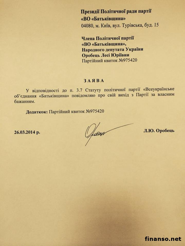 Народный депутат Верховной Рады Украины Леся Оробец на своей страничке в социальной сети Facebook сообщила, что она написала заявление о ее выходе из политической партии ''Батькивщина''.