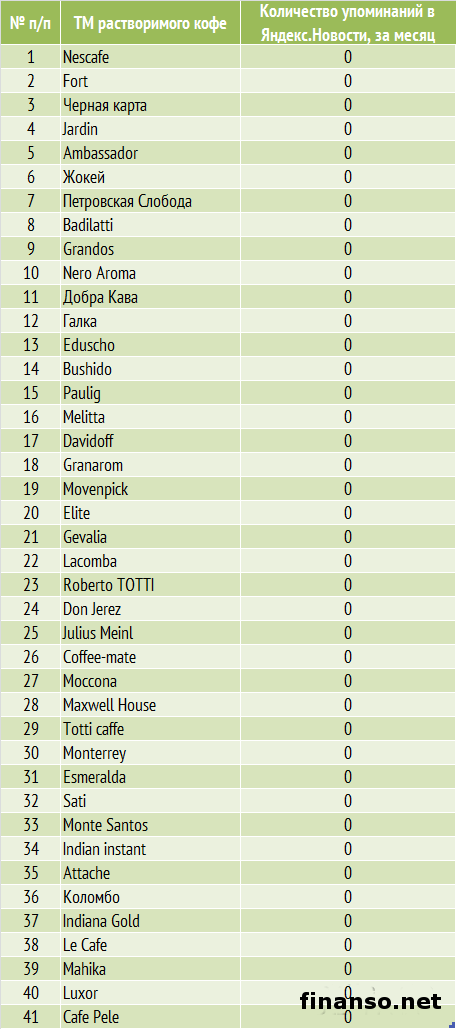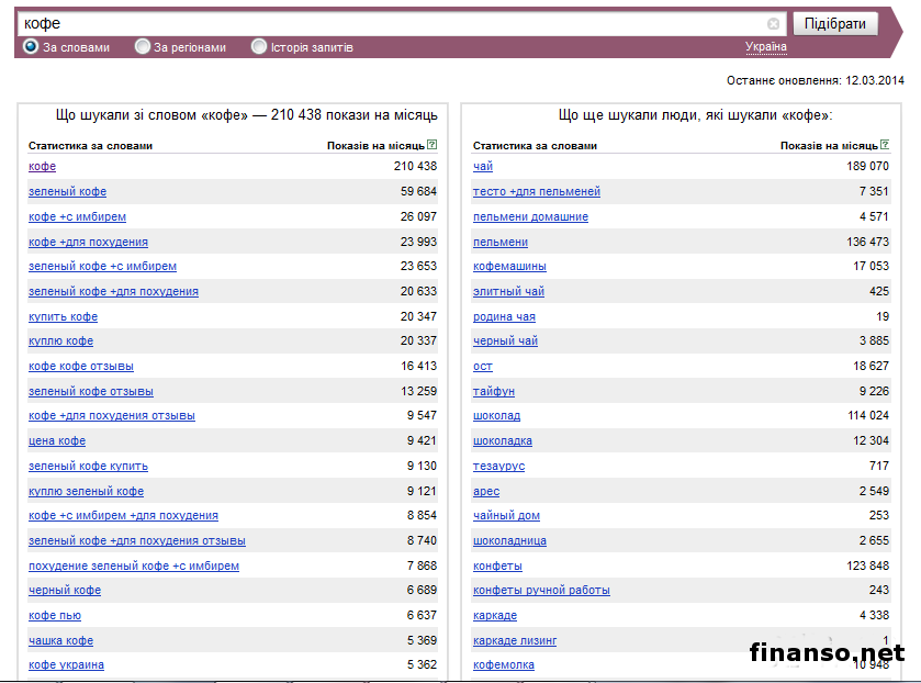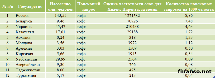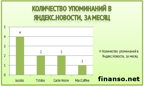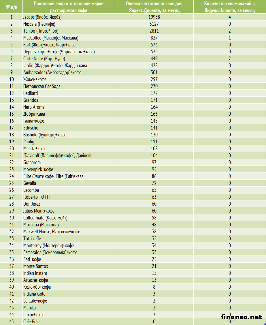 Каким же торговым маркам растворимого кофе украинцы отдали предпочтение в феврале-марте 2014 года, разбирались аналитики издания для инвесторов "Украина сегодня: finanso.net". Лидер по популярности среди украинцев – ТМ "Jacobs".Рейтинг популярности ТМ растворимого кофе основывался на ряде критерий, таких как: - оценка частотности слов для Яндекс.Директа за месяц (рассчитывается при помощи сервиса wordstat.yandex.ru); - частота упоминаний о торговой марке растворимого кофе в украинских интернет-СМИ, рассчитанная с помощью агрегатора Яндекс.Новости (news.yandex.ru); - регион анализа (а значит, и поиска в сервисе wordstat.yandex.ru) – Украина; - период анализа – с 12 февраля по 12 марта 2014 года. Лидером по популярности в Яндексе среди украинцев оказался кофе "Якобс" (19938 запросов украинцев за анализируемый период). Первую позицию рейтинга "Якобс" занимает в течение достаточно длительного периода: таким образом, такая популярность компании объясняет ее высокую прибыльность на украинском рынке. Вторую позицию рейтинга заняла ТМ "Nescafe" (5127 запросов украинцев в Яндексе за месяц). Отстающий от лидера рейтинга почти в четыре раза, Нескафе, тем не менее, уверенно занимает и удерживает вторую ступень рейтинга популярности среди украинцев в Яндексе. В Украине, в отличие от многих других стран, название "Нескафе" не является именем нарицательным, однако это не мешает данной ТМ кофе оставаться популярной и востребованной. На третьей ступени рейтинга популярности оказалась ТМ "Tchibo" (2811 запросов в Яндексе за период с 12 февраля по 12 марта 2014 года). Еще чуть больше отстает о лидера "гонки за популярностью" и "Чибо". Данная торговая марка, пожалуй, одна из наиболее ориентированных на рынок: практически любой потребитель сможет благодаря широкому ассортименту кофе найти наиболее подходящий ему вид бодрящего напитка. Аутсайдерами по популярности оказались следующие торговые марки растворимого кофе: - "Коломбо" (8 запросов украинцев в Яндексе за период с 12 февраля по 12 марта 2014 года); - "Indiana Gold" (3); - "Le Cafe" (2); - "Mahika" (2); - "Luxor" (2); - "Cafе Pele" (0). Жители каких государств интересуются кофе больше всего?С помощью сервиса wordstat.yandex.ru можно определить, для жителей каких государств информация о кофе является наиболее интересной. В целях анализа все данные пересчитываются в расчете на 1 тысячу жителей: По данным представленной таблицы можно сделать такие выводы: - чаще всего кофе интересовались жители РФ – на 1000 россиян пришлось 8,9 запроса за месяц; - высокую заинтересованность в информации о кофе продемонстрировали также жители Белоруссии – на 1 тысячу жителей пришлось 7,5 запроса за анализируемый период; - жители Украины интересовались кофе почти в два раза реже россиян – на 1 тысячу украинцев пришлось 4,6 запроса за период с 12 февраля по 12 марта 2014 года; - наименьшую заинтересованность в информации о бодрящем напитке продемонстрировали жители Узбекистана, Азербайджана, Таджикистана и Туркмении – на 10 тысяч населения в каждой из этих стран пришлось менее 1-го запроса за месяц. Какая информация интересует украинцев при вводе в Яндексе запроса "кофе"?Сервис wordstat.yandex.ru позволяет выяснить, что именно ищут жители Украины, вводя в поисковую строку Яндекса запрос "кофе": Таким образом, наибольшую заинтересованность украинцев при вводе запроса "кофе" в Яндексе вызывают кофе как таковой, а также зеленый кофе, содействую