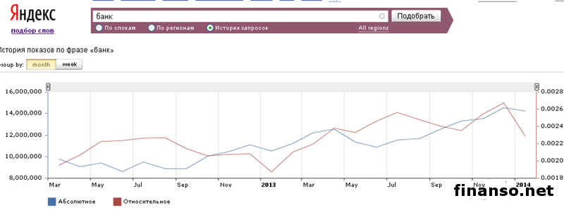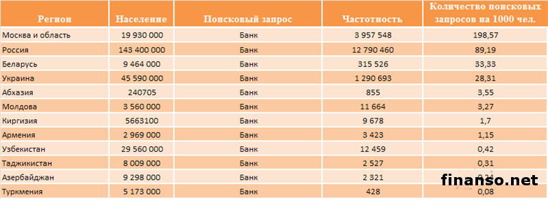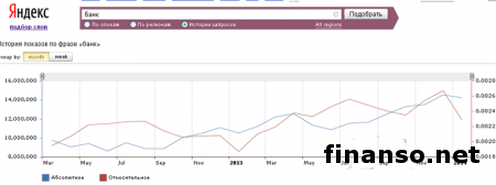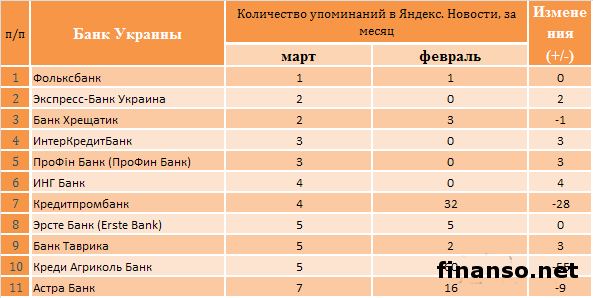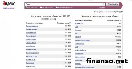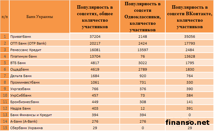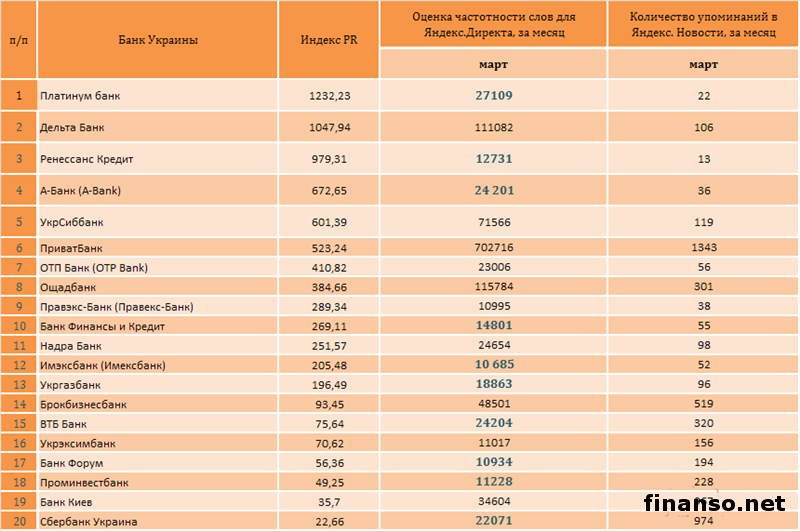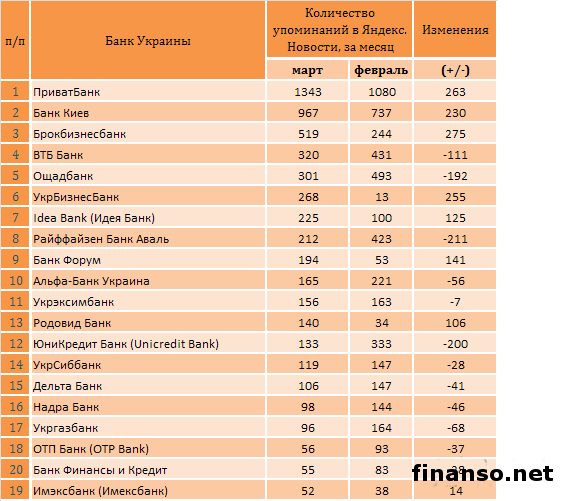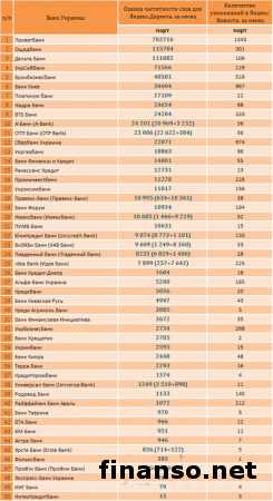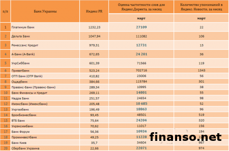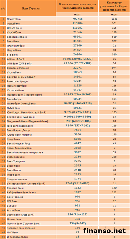 Банк – это коммерческое, независимое, автономное предприятие, сфера деятельности которого не ограничивается ни географическими, ни национальными границами. Финансовые учреждения проводят разные виды операций и предоставляют своим клиентам большой спектр финансовых услуг. Каждый человек в определенное время сталкивается с банком. Если вы хотите сохранить семейные ценности или приумножить свой капитал – вам, определенно, нужно начать сотрудничать с этими финансовыми учреждениями. Банк предоставляет такие виды услуг, как: депозит, оплата коммунальных услуг, а также многие другие. Если вы хотите построить свое будущие – вы это можете сделать с помощью банка. Но как не потеряться среди такого большого количества компаний, предоставляющих финансовые услуги? В связи с этим аналитики издания «Украина сегодня: finanso.net» составили рейтинг банков, которые пользовались наибольшей популярностью в сети Интернет среди жителей Украины в марте текущего года. Топ самых известных банков Украины в Интернете.Аналитики составили рейтинг на базе двух прозрачных и объективных показателей в поисковой системе Яндекс: - оценка частоты введения слов для Яндекс.Директа за месяц, рассчитанная с помощью сервиса wordstat.yandex.ru; - количество упоминаний о финансовых учреждениях за март в электронных СМИ, рассчитанное с помощью агрегатора Яндекс.Новости (news.yandex.ru); - регион поиска – Украина. Лидирующее место в рейтинге, как и прежде, занимает ПриватБанк, который имеет самую крупную сеть отделений и филиалов по всей территории Украины. Банк предоставляет возможность своим клиентам быстро и удобно воспользоваться всем спектром финансовых услуг. На данный момент он является одним из самых больших предприятий на территории Украины, которое обслуживает как физических, так и юридических лиц. Второе место занимает Ощадбанк. Сегодня государственный банк является символом надежности и стабильности. Ощадбанк - это универсальная финансовая структура, которая сосредотачивает свои усилия на создания удобных и выгодных условий для обслуживания своих клиентов, развития сферы банковских услуг и увеличения своей доли на рынке финансов. Третью позицию занимает Дельта Банк, он сосредоточен на работе с коммерческими предприятиями, которые занимаются предоставлением потребительских кредитов, и предлагает одни из самых прибыльных процентных ставок по депозитным вложениям на рынке Украины. Банк также занимается работой с клиентами корпоративного бизнеса. Аутсайдерами в рейтинге стали следующие банки: -Фольксбанк – с показателем 836 запросов в поисковой системе Яндекс за март месяц; - ПроФін Банк – 385 запросов; - Экспресс-Банк Украина – 140 запросов; - ИНГ Банк – 79 запросов; - ИнтерКредитБанк – 15 запросов. Уровень популярности банков в электронных СМИ.Уровень популярности финансовых учреждений также зависит от количества упоминаний о нем в интернет-изданиях. Аналитики «Украина сегодня: finanso.net» выяснили, какое финансовое учреждение чаще всего упоминается в СМИ Интернета. Согласно данным таблицы можно увидеть, что: - на первом месте находится ПриватБанк с показателем 1 343 упоминания в СМИ агрегатора Яндекс.Новости за март месяц; - второе место занимает Банк Киев – 967 упоминаний за месяц; - на третьем месте расположился Брокбизнесбанк – 519 упоминаний за месяц. Жители как