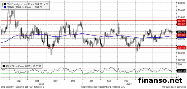 Волатильность стоимости нефти сегодня намного ниже, чем раньше. Движение наблюдается в боковом направлении, и из тактик торговли можно остановить внимание лишь на продаже у верхних границ области, которые определены показателем 112-113 американских долларов.