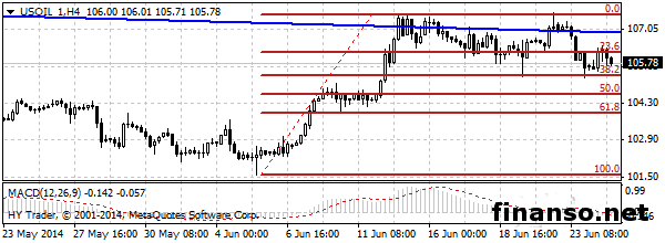 Консолидация нефти происходит чуть ниже $106.00. «Фьючерсы нефти не сумели удержать позиции выше 106 долларов США за баррель вчера, 24 июня», - рассказали представители Форекс-компании HY Markets. Немногим ранее «черное золото» получило поддержку от достаточно сильных статистических данных из Америки, которые по-прежнему поддерживают перспективы спроса на энергоресурсы в Соединенных Штатах. Но игроки рынка Форекс, как и раньше, следят за кризисной ситуацией в Ираке, которая несет угрозу поставкам. Фьючерс на нефть марки WTI с поставками в августе упал на 15 центов и составил 105.87 американского доллара за баррель.