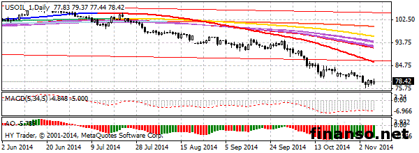 По утверждению экспертов Форекс-рынка, на фоне роста курса доллара, ниже 83 долларов опустились цены на нефть Brent, а руководитель по анализу сырьевых рынков Societe Generale в Сингапуре М. Кинан напомнил, что от решения ОПЭК по добыче, на своем очередном совещании 27 ноября, будет зависеть направление рынка, при этом, считает он, 30-40 процентов составляет возможное сокращения добычи нефти. Об этом сообщают корреспонденты издания «Украина сегодня: Finanso.net».За счет довольно быстрого роста добываемой сланцевой нефти в США к 2018 г., ОПЕК предполагает некоторое уменьшение своей доли мирового нефтяного рынка. В будущем году цены поднимутся, по мнению генсека картеля Абдуллы аль-Бадри, который отметил также, что такие цены не могут долго сохраняться и они, по его прогнозам, должны восстановиться ко второму полугодию следующего года. До своего 3-летнего минимума упала нефть.После снижения (на фоне спекуляций) Саудовской Аравией до своего трехлетнего минимума на экспортируемое топливо в США упала цена топлива марки WTI, а в целом, по сообщению экспертов компании HY Markets, она падает уже шестую неделю подряд. Увеличив спреды для европейских и азиатских потребителей, Саудовская Аравия снизила декабрьские дифференциалы на поставляемые в США все марки нефти. До минимального уровня в этом году, на сорок пять центов, понизил стоимость барреля арабской нефти, поставляемой в США, крупнейший нефтепроизводитель в составе членов ОПЕК. На своем заседании 27 ноября в Вене ОПЭК, добывающая около 40 процентов мировой нефти, обсудит квоты по дальнейшей добыче. Не паниковать призывает эта международная организация. После обнародования статданных о запасах этого сырья в США, несколько позже, нефть в цене выросла. После сообщений о возобновлении в самое ближайшее время добычи сырья на из самых крупных месторождений в Ливии в пятницу нефть возобновила снижение. Прогноз спроса на нефть на ближайшие двадцать лет от ОПЭК также оказал давление на цены. С технической точки зрения, сегодня, 10 ноября, в районе 79,00 находится ближайшее сопротивление, по сведениям экспертов компании HY Markets. Дорогу для повторного тестирования области 76,50, с другой стороны, откроет неспособность закрепиться выше. В ближайшее время рынок нефти может поддержать китайский импорт. |