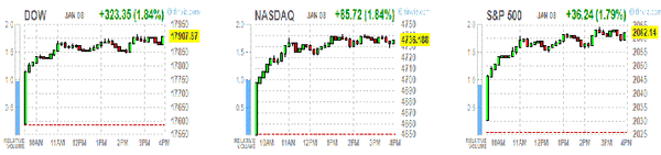 Показав более полутора процентов прироста, второй день подряд находятся в плюсе основные фондовые индексы США. По мнению экспертов компании TeleTrade, спекуляции о том, что поддерживать рост рынка будут центральные банки, даже если американская экономика будет сильной, стали катализатором этого роста. Об этом пишут корреспонденты издания «Украина сегодня: Finanso.net».Новость, что число американцев, первый раз подавших заявки на получение пособия по безработице на прошлой неделе, уменьшилось, вернувшись к минимальным значениям за последние четырнадцать недель, внесло позитив в ход торгов, став сигналом, что ситуация на рынке труда непрерывно улучшается. Достигнув 294 тысяч на неделе, завершившейся третьего января, с учетом сезонных колебаний, на четыре тысячи снизилось число сезонных обращений за пособием по безработице (датчик увольнений) по отчету Минтруда США, экономисты при этом ожидали 291 тысячу заявок. На фоне ожиданий, что ЕЦБ может реализовать новые меры в ходе своего следующего заседания 22 января, настроения по нефти немного восстановились. Об этом рассказывает издание «Биржевой лидер». В плюсе (тридцать из тридцати) завершили торги все компоненты индекса DOW. Акции UnitedHealth Group Incorporated (UNH) выросли больше остальных (+4,70 процента). В плюсе закрылись также все секторы индекса S&P. По сообщению компании TeleTrade, сектор базовых материалов и сектор потребтоваров больше всего выросли, соответственно на 1,9 процента каждый. На позитиве закрылись фондовые индексы АТР.На фоне позитивных тенденций западных фондовых рынков, на таком же позитиве закрылось большинство основных фондовых индексов Азиатско-Тихоокеанского региона, по итогам торгов в пятницу, девятого января. Эксперты форекс-рынка сообщили, что уверенным ростом индексов завершились торги в четверг, где, в частности, ориентировались на Нью-Йорк игроки в Токио. С публикацией данных об американской экономике, которая должна оказаться положительной, по оценкам местных экспертов, подтолкнув доллар к росту по отношению к японской иене, связаны были в прошедшую пятницу ожидания инвесторов. Ориентируясь на внешние рынки, в этом заинтересованы крупные местные корпорации. После того как доходы продавца брендовой одежды Uniqlo превысили оценки аналитиков, ее акции выросли в цене на 0,8 процента. |