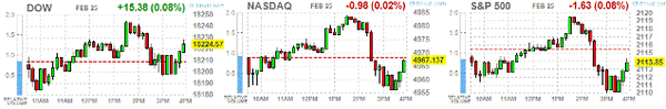 По сообщению экспертов компании TeleTrade, вблизи нулевой отметки закрылись основные фондовые индексы США. Продолжают оценивать выступление главы ФРС Д.Йеллен инвесторы. После начала повышения ставки ФРС продолжит поддерживать экономику страны, заявила Д. Йеллен в ходе своего сегодняшнего выступления и подчеркнула, что значительный вклад в улучшение состояния на рынке внесла текущая денежная политика. Широкий ряд экономических факторов учитывает в своей политике Федрезерв, о чем сообщила также его руководитель. Об этом пишут корреспонденты издания «Украина сегодня: Finanso.net».Компоненты индекса DOW закрылись разнонаправлено.Признаком высокого спроса, содействуя повышению широкого рынка жилья в США, являются остающиеся рядом с шестилетним максимумом темпы продажи новостроек, несмотря на то, что, как отмечается, они слегка снизились в январе. По сообщению Минторга в среду, годового уровня 481 тысячи достигли продажи вновь построенных односемейных домов, снизившись на 0,2%, по сравнению с месяцем ранее. По прогнозам экономистов, продажи должны были сократиться до 477 тысяч. До сезонно скорректированного уровня 4,81 млн. упало в январе, показав самый медленный темп за девять месяцев, количество продаж домов на вторичном рынке, на долю которых приходится около 90% всех покупок в США, согласно опубликованному в понедельник докладу Национальной ассоциации риэлторов. Сдерживают этот рынок, по всей видимости, рост цен и дорогие материалы. Об этом рассказывает издание «Биржевой лидер». Эксперты компании TeleTrade отмечают, что закрепившись выше отметки 61 доллара за баррель, заметно выросла стоимость нефти марки Brent, благодаря данным по Китаю и заявлению министра нефтепромышленности Саудовской Аравии. Ослабление обменного курса доллара также оказало поддержку сырьевым рынкам. Отчет от Минэнерго США, продемонстрировавший на неделе 14-20 февраля увеличение нефтезапасов на 8,4 млн. баррелей до 431,1 млн. баррелей, при ожидаемом росте на 4,7 млн. баррелей, также оказал определенное влияние. Запасы находятся в настоящее время на историческом, с августа 1982 г., максимуме. Разнонаправленно (14 в плюсе, 16 в минусе) закрылись сегодня, 26 февраля, компоненты индекса DOW. Акции Intel Corporation оказались аутсайдером (INTC, -1.48%). Акции McDonald's Corp. выросли больше остальных (MCD, +4.00%). Преимущественно в минусе завершили торги секторы индекса S&P. Сектор комуслуг оказался аутсайдером (-1.2%). Сектор услуг вырос больше всего (+0,2%). |