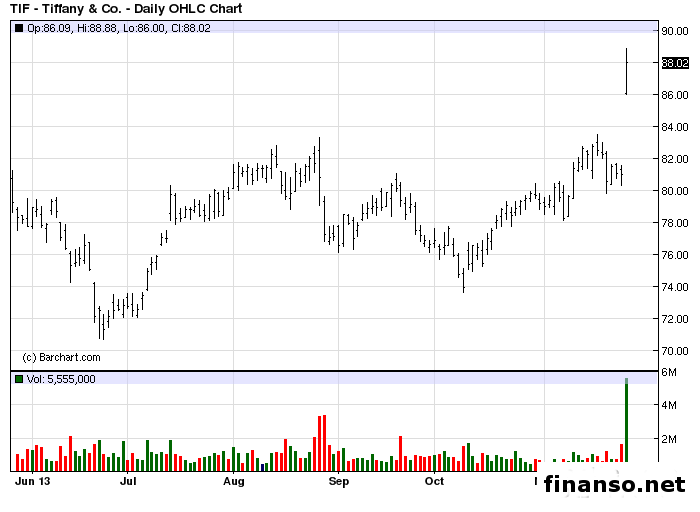 По итогам третьего квартала текущего финансового года объем чистой прибыли второй по величине в мировом масштабе розничной торговой сети, реализующей ювелирные изделия, Tiffany & Co увеличился на 50 процентов. Как уточнили журналисты интернет-издания