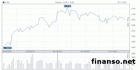 Журналисты интернет-издания Украина сегодня: Finanso.net уточнили, что с января по сентябрь показатель EBITDA компании вырос на 2,5 процента, до 14,606 млрд. долларов. Объем прибыли Лукойла на акцию за 3-й квартал выросла на 48 процентов, до 5,5 долларов на одну.За рассматриваемый отчетный период объем свободного денежного потока компании вырос до 1,6 млрд. долларов, а во 2-ом квартале показатель был на уровне 292 млн. долларов. Ненадежные операции и авансовые платежи, которые входят в капитальные затраты, в третьем квартале были зафиксированы на отметке в 3,8 млрд. долларов. Только за октябрь текущего года Лукойл выплатит промежуточные дивиденды, превышающие предыдущие, начисленные в 2012 году, на 25 процентов. Аналитики брокерской компании TradeFort отмечают, что Лукойл нарастил объем нефтедобычи в России за отчетный период на 1,2 процента, до 63,47 млн. тонн. Курс акций на бирже сегодня, 27 ноября 2013 года, торговался на отметке 2070 долларов США за акцию, - пояснил брокер. Продолжается флет курса акций на бирже. |