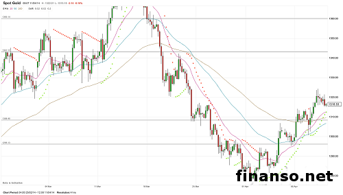 Стоимость золота держится около максимального показателя 2,5 недель по причине уменьшения на фондовых рынках и ожидания того, что Федрезерв в ближайшем времени начнет увеличивать процентные ставки.В пятницу, 11 апреля 2014 года, золото вело торги по 1.318,35 американского доллара за тройскую унцию в сравнении с 1.318,42 на завершение торговых сессий в четверг. За прошлую неделю драгоценный металл набрал в цене 1,2 процента, добравшись в четверг до максимального значения с 24 марта 1.324,40 американского доллара за унцию. Некоторые трейдеры предполагают вероятное замедление роста, говоря об оттоке средств из обеспеченных золотом биржевых фондов и о слабом росте физического спроса на азиатских рынках. Как считают представители компании МОФТ, поделившиеся своими мыслями с корреспондентами издания «Украина сегодня: Finanso.net», золото совершило переход в более высокий диапазон, однако если ему не удастся завершить торговую сессию выше отметки 1.325 доллара, то оно не сможет удержать позиции. Если стоимость снизится за уровень 1.300 долларов за тройскую унцию, то вырастет физический спрос. Привлекательность драгоценного металла в качестве надежного актива увеличилась из-за резкого снижения американского фондового индекса Nasdaq в четверг и падения его на фондовых рынках Азии в пятницу. |