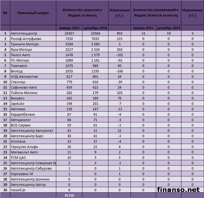 Самые популярные автосервмсы Москвы. Согласно данным вышеуказанной таблицы, видно, что первое место жители Москвы и Московской области отдали автосервису «АвтоСпецЦентр». Поскольку по нему было сделано наибольшее количество запросов за январь 2015-го года – 24 367, можно решительно заявить, что он самый популярный. Является официальным дилером Skoda, с 1998 года на рынке, предоставляет услуги продажи новых автомобилей, оригинальных запчастей, а также аксессуаров, проводит техобслуживание и ремонт. Покупатели «АвтоСпецЦентра» имеют право обмена подержанного автомобиля на новый, могут оформить страховку и кредит, регистрацию ГИБДД в салоне, еще могут установить любое по уровню сложности дополнительное оборудование. «АвтоСпецЦентр» имеет множество преимуществ, к ним можно отнести такие: - круглосуточный режим работы; - оснащение станции современным мощным оборудованием; - способность СТО в кратчайшие сроки отремонтировать авто в полном соответствии требованиям завода-производителя; - все работники имеют квалификацию и прошли обучение по специальным программам. На втором месте автоцентр «Рольф-Алтуфьево». Он набрал 7 250 запросов в Яндексе. Данный автоцентр является одним из лидеров рынка России и крупнейшим продавцом и импортером иностранных марок автомобилей. Их сеть насчитывает около 25 станций в Москве и Петербурге, представляя девять брендов, среди которых есть как массовые, так и премиум-марки. Третье место занял автоцентр «Тринити-Моторс», по которому насчитывается 3 594 запроса за январь этого года в той же поисковой системе Яндекс. На российском автомобильном рынке эта компания фигурирует с 1991 года. Благодаря ей автолюбители из России впервые смогли приобрести новые импортные автомобили «Опель», «Кадиллиак» и «Шевроле» у себя на родине. Компания развивалась быстро, набирая обороты, и сегодня под брендом «Тринити-Моторс» в Москве с успехом работают крупные дилерские центры, осуществляют продажу, обмен, техобслуживание и ремонт автомобилей. «Тринити-Моторс» активно сотрудничает с корпоративными клиентами. Дальше места в 20-ке распределились так: - Яуза Моторс – 2527 запросов в Яндексе; - Пилот Авто – 1478; - РС-Моторс – 1089; - Темпавто – 1079; - Вилгуд – 1035; - АЛД Автомотив – 817; - Стеллер – 779; - Сафоново-Авто – 439; - Тойота-Митино – 282; - Викавто – 265; - JapAuto – 194; - Автомак – 136; - Карданбаланс – 87; - Автодиалог – 68; - BUS-Сервис – 59; - Автотехцентр Авторитет – 43; - Автотехцентр Барс – 38 Общее количество запросов, произведенных россиянами по автосервисам Москвы и области, которые приняли участие в этом рейтинге в поисковой системе Яндекс, за январь нынешнего года составило 45 710.
